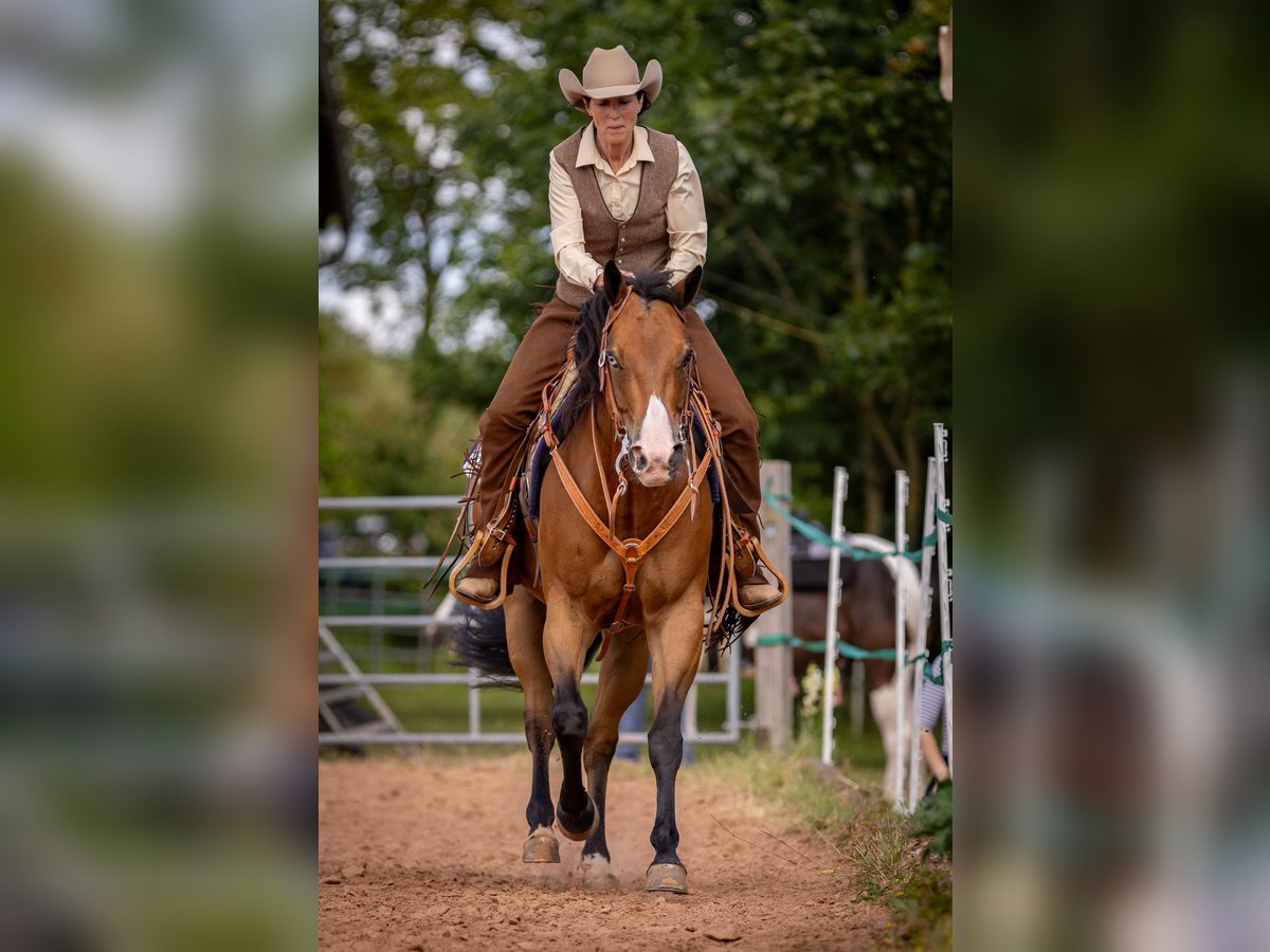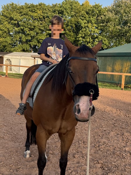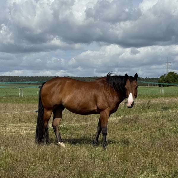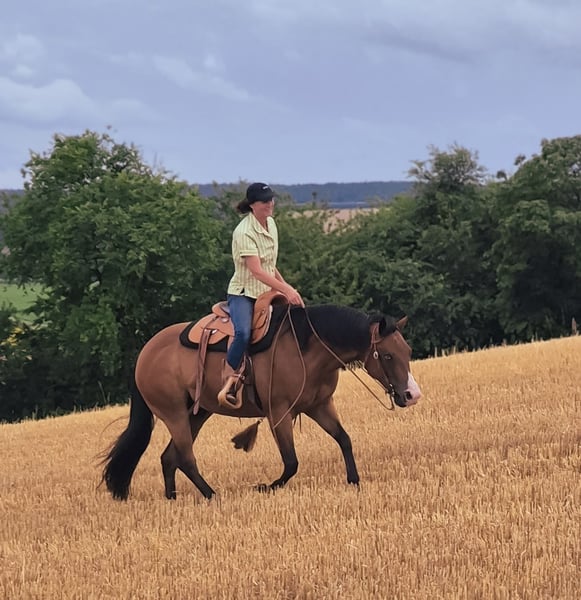 Nur einmal im Leben findet man ein Pferd, dass man nie mehr weggeben wollte und doch ist dieser Schritt aus privaten Gründen nötig Daher suche ich schweren Herzens für meinen Buddy ein neues Zuhause, eine Lebensstellung - 13 jähriger Quarter Horse Wallach Play it again Whiz ( Abstammungen siehe Foto) - Stockmass ca 155 cm - Reining Ausbildung bei Profi Trainer - Ausbildungsstand LK3 mit Möglichkeit zum Aufstieg in LK2 - Geländesicher - Schmiede und verladefromm - Aktuelle Röntgen Bilder liegen vor - Keine Unarten - Geimpft - Wurde regelmäßig beim Zahnarzt und Osteopathen vorgestellt - Passendes Zubehör kann gerne mit erworben werden Buddy ist ein ausgeglichenes, entspanntes und freundliches Pferd, der im Umgang und täglichen Handling ein Goldstück ist ( Schmied, waschen, Kinder, Traktoren, Hunde, Katzen, Silvester, Turnier Atmosphäre) Er geht problemlos alleine ins Gelände, bleibt allein auf der Koppel oder im Walker Er liebt es geputzt und gestreichelt zu werden. Buddy ist ein gut ausgebildetes, gerittenes Pferd ( läuft einhändig im Bit) der fein auf Gewichtshilfen und Körperspannung reagiert Seine Stärken sind Ranch Disziplinen (Ranch Trail, Ranch Riding, Ranch Rail) sowie Trail und Horsemenship Er war bereits mehrfach am Rind und zeigt „cow Sense" hier bräuchte er allerdings noch weitere Ausbildung. Er ist intelligent und liebt die Abwechslung zB auch Freiarbeit Ausritte im Gelände findet er toll und spannend. Er hat dann deutlich mehr Go, lässt sich aber jederzeit regulieren. In unerwarteten Situationen sollte der Reiter gelassen bleiben und ihm Sicherheit geben Momentan steht er in einer Paddock Box mit halbtags Koppelgang Für dieses Traumpferd wünsche ich mir Menschen, die ihn fördern und fordern, Familien Anschluss und eine Lebensstellung Keine reine Boxenhaltung, keine Menschen, die ihn nur als Sportgerät sehen und die sich nur am Wochenende Zeit nehmen können ~ Ein ausgiebiges Kennenlernen ist ausdrücklich erwünscht, bei ernsthaften Interesse freue ich mich über eine kurze Vorstellung - Buddy ist kein Pferd für Händler und Schulbetriebe Eine Abgabe erfolgt ausschließlich an Privat mit vorherigem Kennenlernen des neuem Zuhauses Platz vor Preis! Buddy bedeutet Freund und das soll er auch in Zukunft sein- ein Freund und Seelenverwander