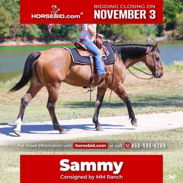 ⚜️𝐓𝐇𝐄 𝐅𝐀𝐋𝐋 𝐇𝐄𝐑𝐈𝐓𝐀𝐆𝐄 𝐂𝐋𝐀𝐒𝐒𝐈𝐂⚜️ Happening now thru MONDAY | NOVEMBER 3rd - Available EXCLUSIVELY on HorseBid's website! For more details and to register visit: www.Horsebid.com CONSIGNOR CONTACT: MM Ranch 469-595-6289 LOCATION: Forney TX BREED: Quarter Horse REGISTERED: No COLOR: Buckskin HEIGHT: 15 AGE: 14 GENDER: Gelding 👻 This is Sammy. 👻 If you are looking for a safe, reliable, and truly versatile gelding, look no further — Sammy is the one. This dead broke gelding stands 15 hands tall, is just 14 years old and makes a statement of being bombproof. Gentle, quiet, and dependable in every way, he is the type of horse that is hard to come by and even harder to let go of. Sammy has been ridden both English and Western, making him suitable for a wide variety of riders and disciplines. Whether you want to enjoy a relaxing trail ride or ride in the arena! He has the mindset to adapt to whatever you ask of him. Sammy has been roped on outside the arena, and handles the job with ease and willingness. He has worked pens at the sale barn and his easy side pass make him the perfect candidate for working and checking your cows out on the ranch! He’s soft and supple in the sides but is definitely a more whoa than go type! Sammy is the same horse every time you saddle him. He rides off quietly, neck reins, and stays light in the bridle. He will walk, trot, and lope on a loose rein, and steps up willingly into a lope from a walk when asked without ever being hot or hard to handle. Out on the trails, he is steady and sure-footed. He crosses water, handles rough terrain, and doesn’t spook at the unexpected. Whether you ride alone or in a group, Sammy stays calm, making him an ideal choice for anyone who values safety and confidence in their horse. He has the kind of mind and disposition that makes him suitable for any rider. Yes even first time riders. (The police officer in the video had never rode a horse before. He got on him and rode him with all his gear on.) He is kind and forgiving for someone learning, yet broke and responsive enough for an experienced hand to enjoy. He is a standout gelding you can trust in any situation. It’s hard to find one this BROKE, and GENTLE! 👻 Sammy is UTD on shots, worming, and farrier work. He is 100% in every way. Absolutely ready to go to his new home. 🌎 We can and will help arrange affordable shipping anywhere.