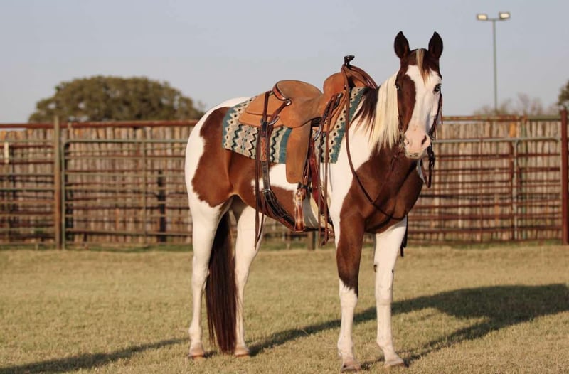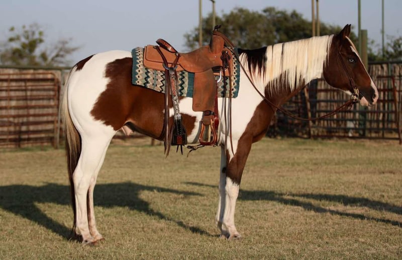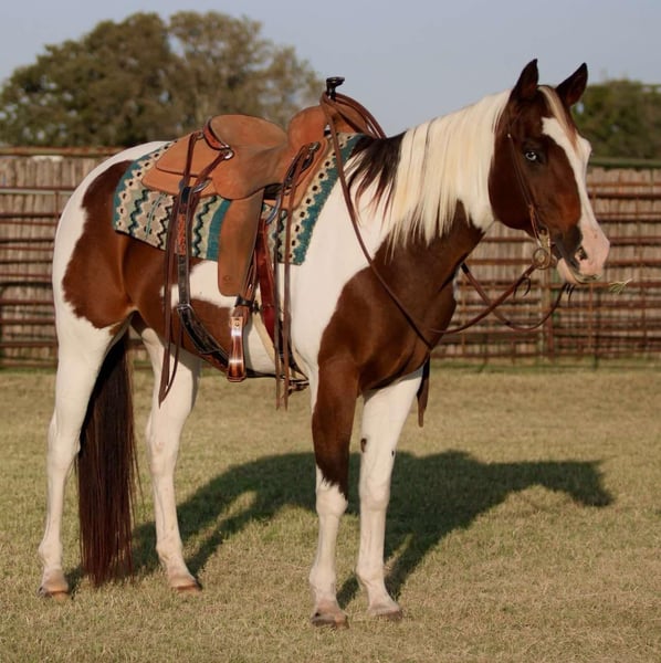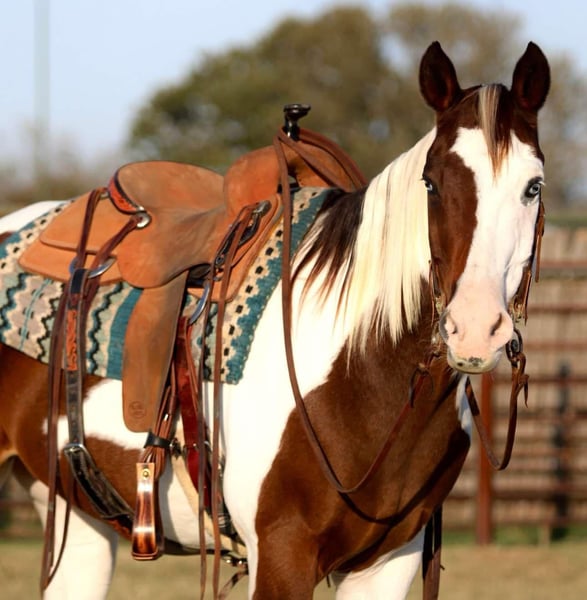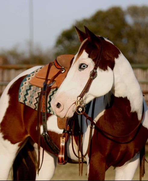 ONLINE AUCTION Place your bids at www.PlatinumEquineAuction.com Starting Bid $3500 Auction ends November 17th, 2024 Need a new saddle? Check out White Rock Saddles on our website or Facebook! Are you ready to own one of the prettiest paint geldings you’ve ever laid eyes on? Well meet 2Faced! He is most definitely one of a kind! He is sure to turn heads anywhere you take him! 2Face is an 13 year old grade gelding. He stands at 15hh tall. He has the most precious face with the prettiest, gentle and kind eye. This pristine gentleman has been used for almost anything you can think of. He is an excellent trail horse! He will gladly climb up or down anything that you point his nose towards. He will happily go through any body of water without missing a beat. He is not spooky on the trails and can handle any situation that you might encounter, whether that be wildlife, fallen trees, ditches, or treacherous terrain. He is a great leader, but also has no issues falling behind in the back if you want him to. He is calm and sure footed. Cow wise, 2Faced has been used to ride through them by and sort at multiple ranches. He will work to make his rider happy and get the job done. He has been hauled out to town and to rodeos with many distractions and keeps his head in the game! He truly is a blessing. He is a breeze to catch and will come up to you anytime he sees you at the gate. He will load in any trailer without any fuss. He stands tied patiently for anything you decide you would like to do with him. He is an absolute gentleman to the farrier and vet. You can shoe him or leave him barefoot, either way is fine by him. He loves baths as well. 2Faced is the perfect addition to any barn. He has such a sweet disposition and loves attention and affection. Located in Lipan Texas We can help arrange hauling anywhere in the US, Hawaii or Canada! Please call or text 817-659-3778. ONLINE AUCTION Place your bids at www.PlatinumEquineAuction.com Starting Bid $3500 Auction ends November 17th, 2024 Need a new saddle? Check out White Rock Saddles on our website or Facebook!