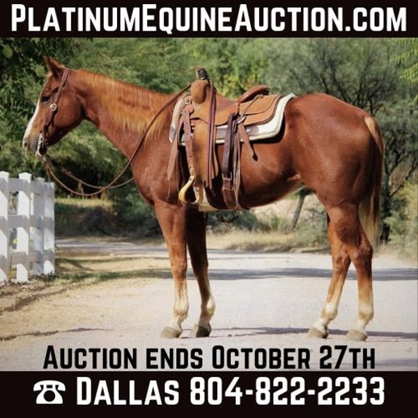 ONLINE AUCTION Place your bids at www.PlatinumEquineAuction.com Starting Bid $3500 Auction ends October 27th, 2024 Need a new saddle? Check out White Rock Saddles on our website or Facebook! Take a look at this handsome fella! Kid is a 13 year old grade gelding standing 15.1hh. With a gentle demeanor and fancy handle, this gelding is sure to excel in any home he goes to! Whether you’re looking to mosey on down the trail, ride the busy streets of town, make fancy patterns in the arena, haul him to the gymkhanas, or hit the ranch trail competitions, this is the gelding for you! Good to groom, saddle, bridle, clip, and shoe. This gentle gelding is safe for absolutely anyone! Point this horse in any direction and he’ll go without hesitation. He will cross water, logs, and rocky terrain. You name it and he’ll go through it, surefooted as can be! Not only is this horse great outside, he is fancy in the arena as well! Billy the kid will walk, trot, and lope both ways on a draped rein, turn around, and side pass both ways. He is never in a rush and will stay as slow or fast as you ask him to go. Freshly shod and floated on 10/03/24. Located in Camp Verde, AZ Can help arrange hauling anywhere in the US!! D/C Equine Dallas 804-822-2233. ONLINE AUCTION Place your bids at www.PlatinumEquineAuction.com Starting Bid $3500 Auction ends October 27th, 2024 Need a new saddle? Check out White Rock Saddles on our website or Facebook!