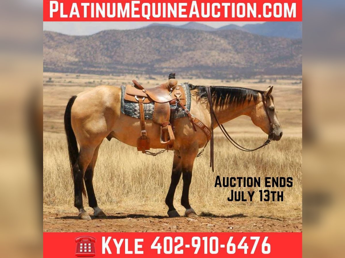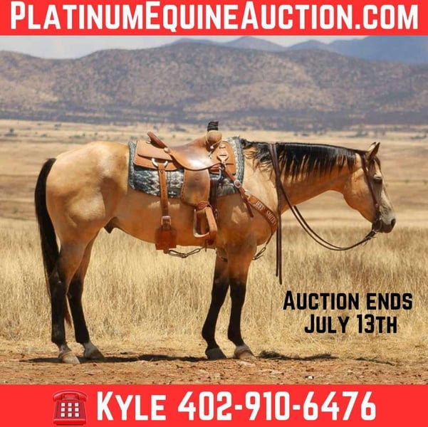 ONLINE AUCTION Place your bids at www.PlatinumEquineAuction.com Starting Bid $3500 Auction ends July 13th 2025 Need a new saddle? Check out White Rock Saddles on our website or Facebook! Once-in-a-Lifetime Buckskin Gelding!!! Zip is a registered APHA, beautiful buckskin gelding, standing 16h and he is a 2010 model. If you’ve been searching for the dream horse — the kind that checks every box and then some — look no further. This stunning Buckskin gelding is the total package. Raised and used on the same working ranch his entire life, he’s seen it all and done it all. From gathering big country to sorting pairs, doctoring in the pasture, loading trucks at the feedlot, used in parades to carry flags, giving lessons in the arena, ranch horse classes and ranch rodeos. This gelding knows a full day’s work and handles it with quiet confidence. He’s fancy broke, soft in the face, neck reins with ease, and moves off your legs like one should. He’s been trail ridden all across the country, seen every kind of terrain, traffic, wildlife — nothing phases him. Safe, safe, SAFE for absolutely anyone — whether you’re putting a beginner on him or using him every day for ranch work, he’ll take care of his rider. Not only is he handy and dependable, but he also has the sweetest puppy-dog personality you could ask for. He loves attention, meets you at the gate, and is always the first to come say hello. Just an easy, kind soul who enjoys being around people and is a true pleasure to handle on the ground. This is a horse you can catch anywhere, anytime — no tricks, no quirks, no bad habits. He’s sound, sane, and solid in every way. The kind you don’t see come up for sale often, and when they do, they don’t last long. Buy with confidence — this is a one-of-a-kind gelding that will turn heads and win hearts wherever he goes. Everyone who’s seen him loves him — and you will too. Zip sells with current x-rays. For more info call Kyle at Thunder Valley Ranch 402-910-6476 We invite anyone to come see him in person in Nogales, AZ. ONLINE AUCTION Place your bids at www.PlatinumEquineAuction.com Starting Bid $3500 Auction ends July 13th 2025 Need a new saddle? Check out White Rock Saddles on our website or Facebook!