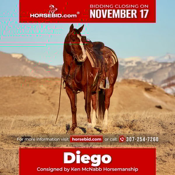 🎲𝓽𝓱𝓮 𝐑𝐈𝐃𝐄𝐑'𝐒 𝓒𝓱𝓸𝓲𝓬𝓮🎲 Happening now thru MONDAY | NOVEMBER 17th - Available EXCLUSIVELY on HorseBid's website! For more details and to register visit: www.Horsebid.com CONSIGNOR CONTACT: Ken McNabb Horsemanship 307-254-7260 LOCATION: Lovell, WY. BREED: QH REGISTERED: No REGISTERED NAME: Diego COLOR: Chestnut HEIGHT: 14.2 AGE: 15 GENDER: Gelding Go! Diego! Go! If you’re looking for a been-there, done-that gelding with plenty of life left, here he is! Diego may have been born in 2010, but in his mind that was just a couple of years ago! He’s full of energy, heart, and try — always ready for his next adventure. Diego is as fun as your favorite carnival ride, as dependable as a Toyota Corolla, and has the work ethic of the Energizer Bunny. He’s quick on his feet but never hot or jiggy — always willing, responsive, and eager to go to work. Over the past year and a half, he’s been my go-to horse for everything from wrangling horses and gathering cattle to halter breaking colts and leading out young pack horses If I can Do it horseback I’ve done it on Diego! In the arena, he’s just as fun! Diego has a solid one-hand neck rein, moves lightly off your leg, picks up both leads with ease, has a smooth pivot and nice side pass. On the trail, Diego is sure-footed, steady, and sane. This is one quarter horse gelding that will make your gaited horse friends jealous! With the ability to walk fast or slow, he specializes in meeting the riders needs . He crosses ditches, logs, creeks and anything else that may come across your way without hesitation. I have ridden him all over the desert and mountains and he is one of the most sure footed horses I’ve ever ridden! Diego brings all the fun you could want paired with the dependability of the seasoned horse he is! He’s truly been there, done that, and is ready for his next adventure with you! Stands well for the farrier and vet, loads and hauls like a pro, and loves baths. PPE welcome at buyer’s expense. Up to date on shots and Coggins. Ridden by: Nicole Mitchell Contact: Ken McNabb 📞 307-254-7260