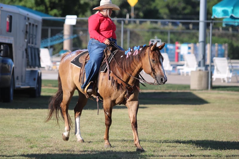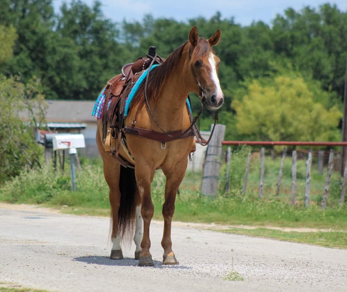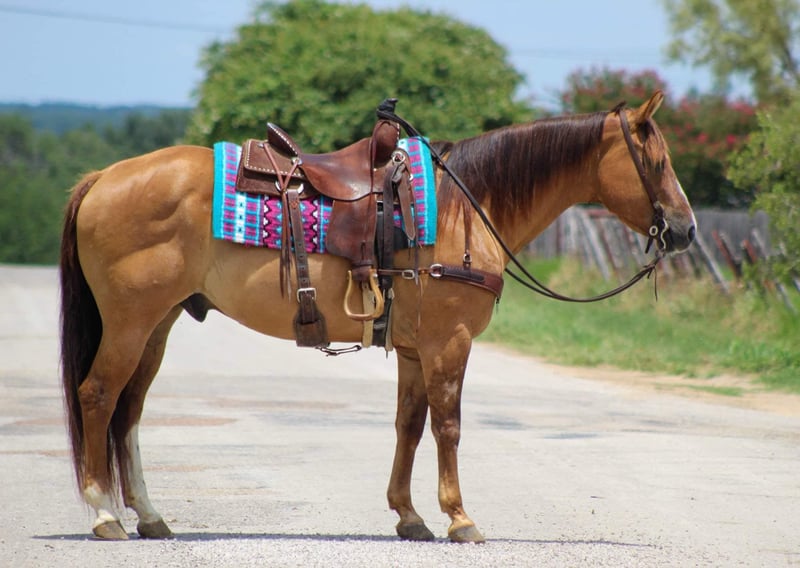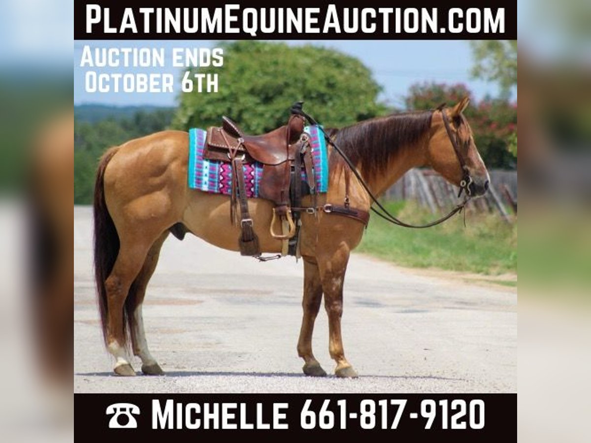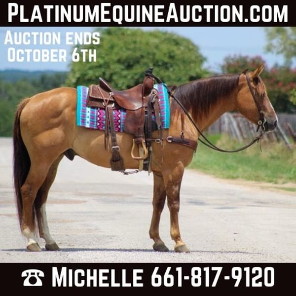 ONLINE AUCTION Place your bids at www.PlatinumEquineAuction.com Starting Bid $3500 Auction ends October 6th, 2024 Need a new saddle? Check out White Rock Saddles on our website or Facebook! If you’re looking for one that is seasoned , tried and true then this guy is the one for you! “Dunny” is a 14 year old gorgeous , stout made red dun gelding standing 15.1 hds tall and has the looks to boot ! This sweet loving gelding has seen the sights and been hauled around the world . He has dabbled in about a little bit of everything he was shown on a college equestrian team for many years and rode by many different riders on the teams . He has a beautiful slow walk , trot and lope and also low headed with a great stop ! He is very user friendly and forgiving. Dunny is awesome out on the trails and will go anywhere you point him! He has been down the famous bricks of Exchange Ave at the Fort Worth Stockyards with crowds of people , traffic and all kinds of commotion and he did it bridle less! He enjoys going down the trails will cross water , rocks , bridges , tarps with no issues at all . Put him in the front , back or middle and he is fine or if you just want to go out on nice rides by yourself Dunny doesn’t mind that either . We recently rode him in our Fourth of July parade and he was a rockstar as always! Dunny is one the whole family can enjoy! He isn’t one that needs rode consistently leave him turned out for months catch him up and go for a ride . He is currently turned out in a pasture with three other geldings he gets along with everyone. Easy to catch , groom , tack up . He loads and unloads with no issues at all . His teeth were just floated , and just got a new set of shoes put on . He’s ready to go to his new forever home . Watch his video and you will fall In love. Contact us to come try him , or we can set up a FaceTime also. If you need help with transport don’t hesitate to ask we have a list of reputable haulers that can get him safely to your doorstep world wide. Located in Stephenville, TX. Contact M $ Performance Horses Michelle 661-817-9120. ONLINE AUCTION Place your bids at www.PlatinumEquineAuction.com Starting Bid $3500 Auction ends October 6th, 2024 Need a new saddle? Check out White Rock Saddles on our website or Facebook!