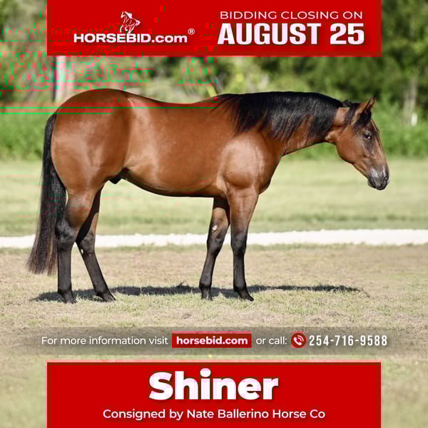 ⭐️ 𝐀𝐔𝐆𝐔𝐒𝐓 𝓐𝓵𝓵 𝓢𝓽𝓪𝓻 𝓛𝓲𝓷𝓮𝓾𝓹 ⭐️ Happening now thru MONDAY | AUGUST 25th - Available EXCLUSIVELY on HorseBid's website! For more details and to register visit: www.Horsebid.com CONSIGNOR CONTACT: Nate Ballerino Horse Co 254-716-9588 LOCATION: Waco,Tx BREED: QH REGISTERED: Yes REGISTERED NAME: CS MEGA ATTRACTION COLOR: Bay HEIGHT: 14.3 AGE: 2 GENDER: Gelding CS Mega Attraction has spent his time in a reining program. Shiner takes both his leads, has a big sliding stop, Spins both ways, stays soft, supple and is big enough for any job. He is lightly started on the calf sled and has been pen roped on. Please Call Nate Ballerino at 254-716-9588 with any questions. Nation wide shipping can be arranged.