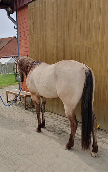 4 Jähriger AQHA Wallach mit Papieren, Panel N/N über Eltern. Gegen Tetanus und Influenza geimpft, regelm. Entwurmt, kennt Bodenarbeit und sucht einen Menschen der ihn weiter fördert. Stm vorne 148cm hinten 150cm. Ausgeglichenes Temperament. Steht Nachts in der Box und tagsüber im Offenstall. Absolut Herdenverträglich. Röntgenbilder gerne per Email oder WhatsApp.