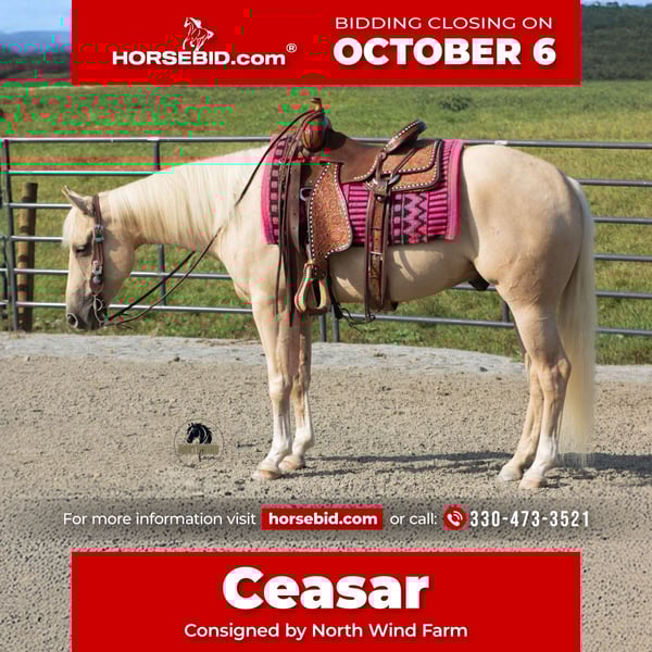 🍂 𝓐𝓾𝓽𝓾𝓶𝓷 𝑨𝑳𝑳 𝑺𝑻𝑨𝑹 𝑳𝑰𝑵𝑬𝑼𝑷 🍂 Happening now thru MONDAY | OCTOBER 6th - Available EXCLUSIVELY on HorseBid's website! For more details and to register visit: www.Horsebid.com CONSIGNOR CONTACT: North Wind Farm 330-473-3521 LOCATION: Fredericksburg OH BREED: AQHA REGISTERED: Yes REGISTERED NAME: Seizing The day COLOR: Palomino HEIGHT: 15 AGE: 4 GENDER: Gelding Seizing The Day, “Ceasar” is a 4 yr old registered palomino gelding, standing at 15hh! Ceasar is bred very nicely and is well broke to ride! Ceasar has the most fun to ride walk, trot, canter! He is smooth and soft in his face! He has the sweetest personality and has great ground manners! He stands good for grooming, tacking up, getting his feet done and getting bathes! He loves attention and has a puppy dog personality! He can be turned out in the pasture with other horses and will greet you at the gate! He loads and trailers well! Ceaser rides great in the arena, he will pick up both leads, stop, and back up with no issues! He will do the trot poles, and back through the poles as well! He does a side pass and slow pivot! Ceaser will go through all the obstacles and is confident doing it! He will step over logs, crosses the bridge and tires! He will also step up on the block!He is no stranger to the tarp or the ball, he doesn’t mind them at all. He will also carry the flag! He can be roped off of and will drag the log. Ceaser is very good on the trails, he loves the creeks, is sure footed going the hills, and is quiet! He is a dream trail partner! He rides bareback and western! He stands nicely at the mounting block. He has a flowy canter and a trot that is easy to sit too! He is responisve and easy going! Ceaser is safe for all levels of riders! He is safe, quiet and confident! Contact us for more info on this beautiful gelding! ⭐️North Wind Farm is renowned for its quality trail and all-around horses. Our horses are versatile and can excel in any discipline, making them perfect for riders of all levels. Whether you're looking for a reliable trail companion or a horse that can perform in various disciplines, North Wind Farm has the perfect match for you. Our commitment to excellence and passion for equine care ensures that each horse is well-trained, healthy, and ready to meet your needs. Contact us @ Tim (330) 600-8840 Lisa (330) 473-3521.