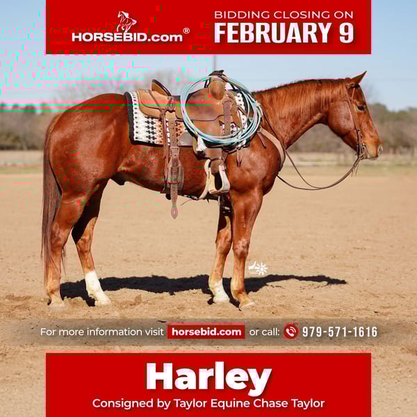 ❤️🔥𝑩𝒆 𝑴𝒊𝒏𝒆 𝐒𝐄𝐋𝐄𝐂𝐓❤️🔥 Happening now thru MONDAY | FEBRUARY 9th - Available EXCLUSIVELY on HorseBid's website! For more details and to register visit: www.Horsebid.com CONSIGNOR CONTACT: Taylor Equine Chase Taylor 979-571-1616 LOCATION: Huntsville Texas BREED: Quarter REGISTERED: Yes REGISTERED NAME: TO SHOOT THE BOON COLOR: Sorrel HEIGHT: 15 AGE: 4 GENDER: Gelding Harley is a talented, athletic young gelding with a strong work ethic and a solid foundation. He has spent time in the feedyard and riding pens, giving him valuable real-world experience and an understanding of a full day’s work. Harley would make an excellent ranch horse—one you’ll look forward to catching and riding every day, in any weather. He has been started in both heading and heeling and is showing exceptional promise as a future rope horse.