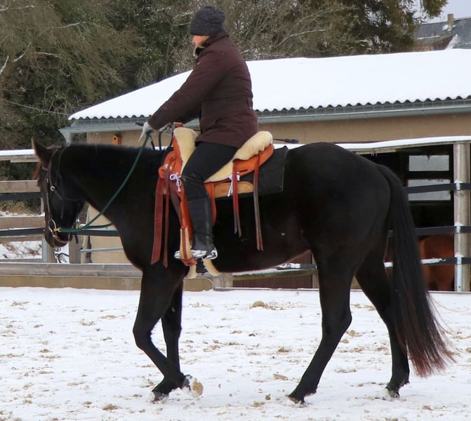 Bildschönen, vierjährigen Quarter Horse Rappwallach, momentan 1.55m groß, in weiter fördernde Hände zu verkaufen. Er ist bereits gut angeritten, geht allein und in der Gruppe ins Gelände. Dabei ist er souverän, motiviert und immer händelbar. Ob als gehobenes Freizeitpferd oder für den Sport, er kann beides sein. Er war bereits außerhalb auf Kursen dabei, wobei er absolut cool ist. Er kennt die Basics der Bodenarbeit, wird im Natural Horsemanship gearbeitet und ausgebildet. Hängerfahren, Schmied, Impfen, alles kein Problem. Er ist Tetanus und Influenza geimpft. Er ist barhuf und wird aller 8 Wochen dem Schmied vorgestellt. Dabei ist er immer artig. Jährlicher Routinecheck beim Zahnarzt 2025 ohne Mängel. Auch der jährliche Routinecheck beim Osteopathen war ohne Auffälligkeiten. Er ist sehr zutraulich, neugierig und menschenbezogen und eher der ruhige und relaxte Typ. Er hört auf seinen Namen und kommt auf Zuruf. Auf Grund seines Alters nicht an Anfänger oder Wiedereinsteiger, denn er braucht eine klare und faire Führung. Er arbeitet immer motiviert mit, hat prima Voraussetzungen ein toller Pferdekumpel zu werden. Er kann mit Knotenhalfter genauso wie auf Trense geritten werden. Kennt Seitengänge, Vorhand und Hinterhandwendungen, steht brav beim Aufsitzen. Kennt Doppellonge, fährt problemlos Anhänger. Ist sehr sozial und in der Herde im mittleren Rang. Er sucht keinen Streit, geht diesem lieber aus dem Weg. Er lebt in Offenstallhaltung und das soll auch unbedingt so weitergeführt werden. Er kennt Straßenverkehr, Traktoren und jegliches landwirtschaftliche Gefährt, damit geht er sehr souverän um. Aufgrund seiner Statur und toll zu sitzenden Gängen könnte ich mir ihn gut im Reining/ Dressursport vorstellen. Er hat einen tollen Jog und einen butterwechen Galopp. Ein kleiner Rohdiamant welcher bei weiterer guter Ausbildung richtig Freude machen wird. Er hat volle Papiere und einen Pass von der AQHA (American Quarter Horse Assoziation) Papiere und Videos können auf Anfrage gerne zur Ansicht bereitgestellt werden. Standort wäre Nähe Dresden/Sachsen Nicht nur merken, einfach anschreiben, wir beißen nicht;)