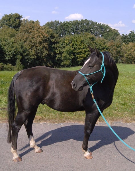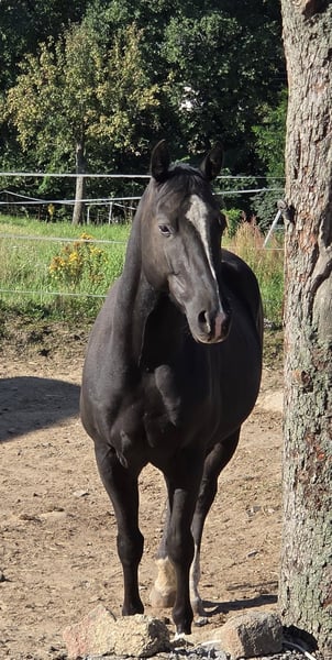 Rooster King Leo - ein bildschöner Quarter Horse Wallach, geboren im März 2020. Mit seiner eleganten schwarzen Farbe, einem kompakten, korrekten Gebäude und einem besonders ausdrucksstarken Auftreten zieht er sofort die Blicke auf sich. Er misst etwa 147 cm und überzeugt nicht nur äußerlich, sondern auch mit einem feinen, sensiblen Charakter. Poldi ist sehr menschenbezogen, verschmust, neugierig und reagiert ausgesprochen gut auf Stimme und Körpersprache. Gleichzeitig bringt er eine gewisse Sensibilität mit und braucht daher eine feste, vertrauensvolle Bezugsperson. Für Anfänger ist er nicht geeignet - gesucht wird ein erfahrener, ruhiger Pferdemensch, der ohne Druck, aber mit Einfühlungsvermögen und Geduld mit ihm arbeitet. Poldi bringt eine solide Westerngrundausbildung mit, kennt die Bodenarbeit und wurde zuletzt mit Bosal geritten. Da er im vergangenen Jahr nur sporadisch gearbeitet wurde, befindet er sich aktuell nicht im Training und muss muskulär wieder aufgebaut werden. Er wurde regelmäßig geimpft und entwurmt, ist derzeit barhuf und schmiede- sowie verladefromm. Poldi kennt sowohl Offenstall- als auch Boxenhaltung und steht aktuell in einer gemischten Herde im Offenstall. Er war bislang immer gesund. Eine klinische Ankaufsuntersuchung aus Juni 2024 liegt vor - mit dem einzigen Befund eines leichten Überbisses, der ihn bislang nicht beeinträchtigt. Röntgenbilder der Sprunggelenke aus demselben Zeitraum sind unauffällig. Die Zähne wurden zuletzt im April 2025 gemacht. Poldi wird schweren Herzens abgegeben, da seine jetzige Besitzerin ihm unter dem Sattel nicht die Sicherheit geben kann, die er braucht. Er eignet sich ideal für jemanden, der bereit ist, mit Ruhe und Gefühl eine vertrauensvolle Partnerschaft aufzubauen und das Potenzial dieses besonderen Pferdes weiter zu fördern.