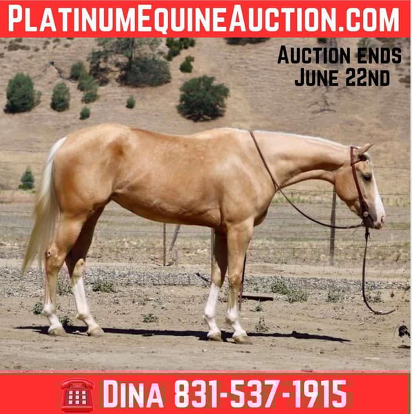 ONLINE AUCTION Place your bids at www.PlatinumEquineAuction.com Starting Bid $3500 Auction ends June 22nd, 2025 Need a new saddle? Check out White Rock Saddles on our website or Facebook! Your Dream Golden Palomino Mare Awaits. If you’ve been searching for a horse that combines beauty, brains, and talent, your search ends here. Meet Ariana,a spectacular golden palomino mare standing at 15 hands and only 4 years old. This isn’t just a pretty horse; she’s a dream to ride, possessing the cool demeanor and training of a seasoned reiner. Ariana is responsive and graceful, bending at the poll and moving her hips and sides with subtle leg cues. She executes smooth turnarounds and slides with ease, making her a standout in the arena. She picks up all her gaits with fluidity and class, loping perfect circles and transitioning seamlessly. Beyond her training, Ariana is a friendly horse, always eager to greet you with a gentle nuzzle. Her versatility extends beyond the arena. Ariana has a natural affinity for cows and has been started on lead steer, showing great promise. She’s been actively used to gather and sort cattle, proving to be a reliable and enjoyable partner. On the trails, Ariana is equally confident, navigating narrow paths, water crossings, and encounters with wildlife with remarkable composure. Ariana safe and reliable nature makes her suitable for a wide range of riders and disciplines. She has confidently tackled obstacles, including bridges, tires, and flags. She’s unfazed by farm equipment like tractors, four-wheelers, and quads, and is safe to ride down the road. This mare is a true pleasure to ride, saddling up with ease, standing patiently when tied, and behaving impeccably for the farrier and vet. She hauls well and adapts quickly to new environments. If you’re longing for your next best friend and equine partner, Arana is the one. Contact Longhorn Ranch, Dina at 831-537-1915, located in Paicines, CA, to schedule a visit and experience the magic of Ariana firsthand. ONLINE AUCTION Place your bids at www.PlatinumEquineAuction.com Starting Bid $3500 Auction ends June 22nd, 2025 Need a new saddle? Check out White Rock Saddles on our website or Facebook!