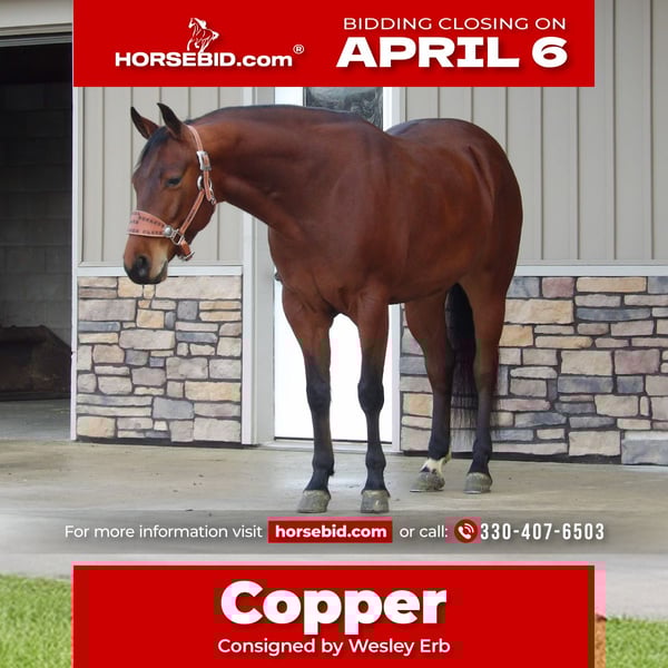 🌟𝑨𝒑𝒓𝒊𝒍 𝐀𝐋𝐋 𝐒𝐓𝐀𝐑 𝐋𝐈𝐍𝐄𝐔𝐏🌟 Happening now thru MONDAY | APRIL 6th - Available EXCLUSIVELY on HorseBid's website! For more details and to register visit: www.Horsebid.com CONSIGNOR CONTACT: Wesley Erb 330-407-6503 LOCATION: Baltic, OH BREED: Quarter horse REGISTERED: Yes REGISTERED NAME: Instant Spookocracy COLOR: Bay HEIGHT: 15.1 AGE: 5 GENDER: Gelding Wow it only takes one word to describe him ,versatile!! Copper is truly a one of a kind horse whether you are looking to go show in reining, ranch riding, reined cowhorse or just a nice all around family horse that you can go trail ride and go rope or show on the weekend. Instant Spookocracy (Copper) is sired by the great Tricked Out Spook, (Spooks Gotta Gun × Rowdy Brinna),who has LTE 75,000+ and offspring earnings of 815,000+ and rising fast. His highest earning offspring has 96,000 in earnings and still has a few years to show. WRM Quick Sue is his dam who is by (Instant Playboy ×Sister Hallmarked) Copper is a 5 yr old bay gelding registered with the aqha that I got as a 2 yr old and have used him as my go to horse ever since. It doesn't matter if you ride him 7 days or once a month he doesn't mind.He has been ridin in the arena as well as out on the trails and on the roads and is save with traffic. He has also been to some ranch shows and has been reserve multiple times and has been to lots of ranch rodeos in front of huge crowds of people and has helped us win a few rodeos and was awarded top horse in one rodeo and is really smart on a cow. He knows all the maneuvers in the arena from flying lead changes to sliding stops.However he does crib if u don't keep a collar on him but it does not affect him in any way. He has been ridin by youth kids and will take care of them . PPE's are welcome at your expense. Feel free to call or text me at (330 407 6503) if you're looking for your dream horse.