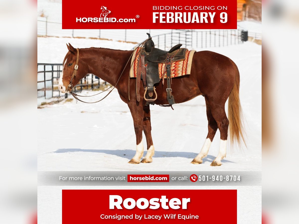 ❤️🔥𝑩𝒆 𝑴𝒊𝒏𝒆 𝐒𝐄𝐋𝐄𝐂𝐓❤️🔥 Happening now thru MONDAY | FEBRUARY 9th - Available EXCLUSIVELY on HorseBid's website! For more details and to register visit: www.Horsebid.com CONSIGNOR CONTACT: Lacey Wilf Equine 501-940-8704 LOCATION: Quitman, AR BREED: Quarter Horse REGISTERED: No REGISTERED NAME: Rooster COLOR: Sorrel HEIGHT: 15.1 AGE: 5 GENDER: Gelding Rooster is the kind that makes every day feel uncomplicated. A 5-year-old Quarter Horse gelding standing 15.1 hands, he wears a deep cherry red coat that turns heads, paired with four clean white socks and a bold blaze that give him undeniable presence. Good to be around on the ground and confident under saddle, he’s the kind of horse that settles a program the moment he steps into it. He’s been everywhere a real horse ought to go. Miles of trail in all kinds of weather, navigating rain, mud, water, and natural obstacles with a quiet, forward confidence. In town, he’s not phased by traffic, trains passing, or other distractions. He’s been used extensively at the stockyards and around cattle, opening and closing gates, loading trucks, sorting, and staying level-headed when things get busy. When winter rolls in, Rooster doesn’t miss a beat — he’s been ridden in the snow and even pulled a sled, taking it all in stride with the same steady willingness. In the arena, he’s handy and correct. He picks up both leads easily, carries a good handle, and sits down into a big, honest stop. He has the mind and foundation to excel as a rope horse, while remaining versatile enough to fit a wide range of programs and riders. He’s easy to catch, comfortable stalled or turned out, and gets along well with other horses. Simple to groom, tack, mount, and haul, stands tied without fuss, good with his feet, and currently barefoot with solid, healthy hooves. Rooster sells 100 percent sound. He’s the kind of gelding that fits seamlessly into a program and earns his keep from day one — steady, capable, and easy to rely on. Watch his full Youtube video, feel free to reach out with any questions, and arrange a visit or a FaceTime with Rooster!