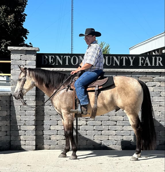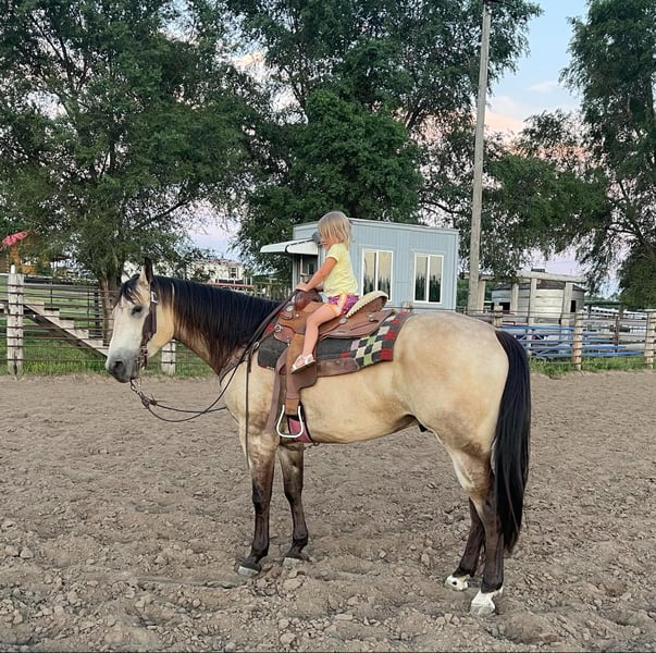 ONLINE AUCTION Place your bids at www.PlatinumEquineAuction.com Starting Bid $3500 Auction ends January 26th, 2025 Need a new saddle? Check out White Rock Saddles on our website or Facebook! Adrifty Smokin Vegas is a stunning 5 year old 15.3-hand buttermilk buckskin gelding weighing 1,400 pounds and standing out as an exceptional ranch prospect. Vegas has excellent bloodlines including Mr Jess Perry and Smokin Blackburn. Versatile and well-trained, he’s been used for a variety of jobs, from roping the hot heels and roping mule. Vegas has been on hundreds of miles of trails including Palo Duro Canyon, the Canadian Red River and Matzel Game Reserve multiple times. Vegas has been a trusted part of a lesson program, working with children & adults of varying skill levels. He is traffic safe and used to farm machinery including tractors & skid loaders. He is safe around dogs, cattle, and all other types of animals. We have used him to break colts to lead and pony our older contestant horses. Vegas has been patterned on the barrels and shown in 4H. He excels in trail competition and obstacles. Vegas has outstanding ground manners & is easy to catch, gets along well with other horses and ponies. and thrives on attention. Stands like a statue for the farrier, cross ties, bathes and clips perfectly. He will load in any size trailer from a 2 horse to a stock trailer. Vegas has had the best care including vaccinations, teeth, and worming. He has no allergies or bad habits. He is good in a stall or a pasture. Vegas is very willing to learn new job skills and is very talented. Vegas is very kind he has never offered to buck, kick, strike or bite ever. 100% sound in mind, body, and spirit, making him a reliable and well-rounded partner for any family. For further details or videos of this beautiful gelding, contact John McPhail 319-721-7714.