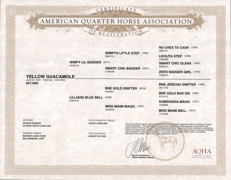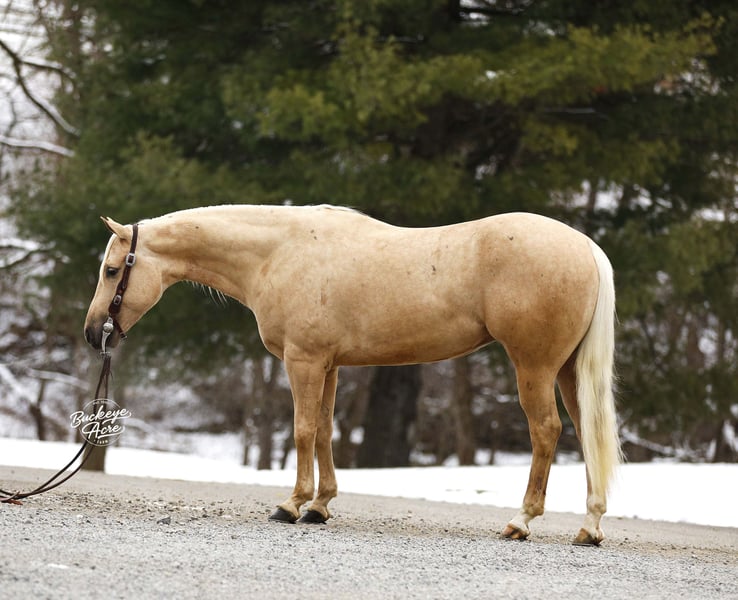 Meet Platinum, a golden palomino gelding with a heart as big as his presence. This 2021 model, 14.2-hand AQHA gelding comes from an exceptional lineage, including Wimpys Little Step, Nu Chex To Cash, and Smart Little Lena. With his flowing mane and tail, bright eye, two white hind socks, and a small white strip on his forehead, Platinum is a horse who naturally draws attention and admiration wherever he goes. Platinum is not just a beautiful horse – he’s a partner you can rely on. He has explored miles of trails, crossed state roads with traffic, and helped check cows and fence lines in the back pastures. He confidently navigates uphill, downhill, over logs, and through challenging terrain, all with his rare, willing-to-please attitude. Every ride with Platinum is smooth and enjoyable, whether at a walk, trot, extended trot, or canter. He knows his leads, performs lead changes, and can side pass right up to the mounting block, making him versatile for every type of ride. He has been ridden western, English, and bareback, in both indoor and outdoor arenas, and is safe and dependable for riders of any skill level – beginner, senior, or advanced. Platinum does not require daily riding to stay consistent; he’s just as ready for a quiet trail ride one day as he is for a show the next. He rides well alone or in a group and enjoys the company of other horses. He loves greeting you at the gate, getting some scratches, and offering his gentle companionship. Platinum needs no maintenance at all. He is up to date on vaccinations, deworming, and shoeing, and thrives without any extra care, making him perfect for someone looking for a versatile, dependable partner. If you are looking for a dependable, kind-hearted, and adaptable horse who can be a family partner, trail companion, or performance mount, Platinum may be the perfect fit. For more information or to schedule a visit to meet him in person, please reach out to Duane at 330-231-2324. Come see this golden gelding in action – he is ready to be your next equine friend.