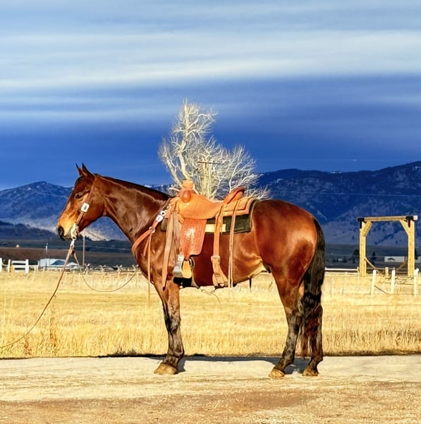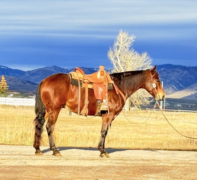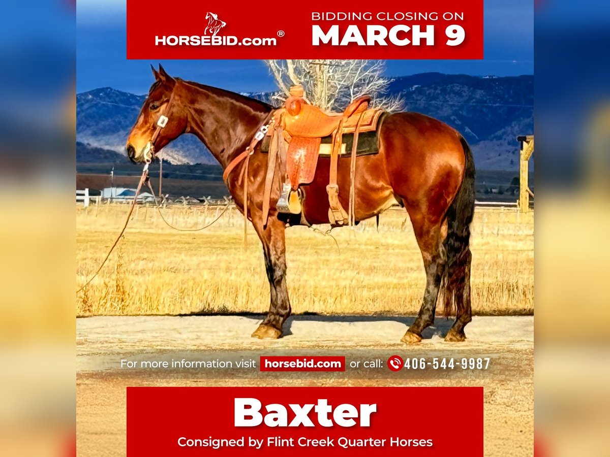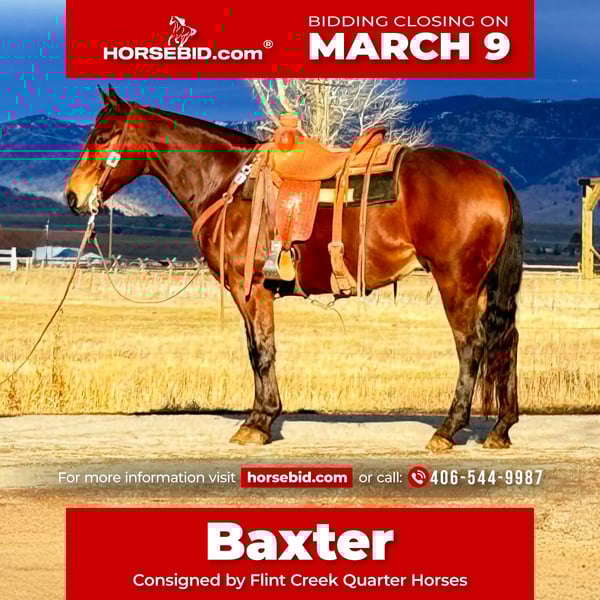 ℳ𝒶𝓇𝒸𝒽 ♦️𝐑𝐈𝐃𝐄𝐑'𝐒 𝐂𝐇𝐎𝐈𝐂𝐄♦️ Happening now thru MONDAY | MARCH 9th - Available EXCLUSIVELY on HorseBid's website! For more details and to register visit: www.Horsebid.com CONSIGNOR CONTACT: Flint Creek Quarter Horses 406-544-9987 LOCATION: Drummond, MT BREED: Quarter Horse REGISTERED: No COLOR: Bay HEIGHT: 14.3 AGE: 6 GENDER: Gelding Baxter is a gorgeous 6-year-old grade bay gelding standing 14.3 hands tall. He is stout made, shapey, and put together the right way. He is a seasoned trail horse with lots of miles exploring mountain country and truly enjoys seeing new terrain. He has also been used on the ranch to check and move pasture cattle. Baxter neck reins one-handed and will ease around on a loose rein wherever he’s pointed. He moves off leg pressure and is simple to operate. He has a smooth, rocking-chair lope and is comfortable in all his gaits. He picks up both leads with ease and lopes beautiful circles. Lead him to a mounting block, smooch to him, and he’ll side step over to make getting on easy. He has never offered to buck or be humpy and is good to shoe, haul, and bathe. This is a beautiful bay gelding in the prime of his life with the ability to go many different directions. Feel free to call or text to learn more about Baxter — or come try him before he sells. Call or text Tom: 406-544-9987