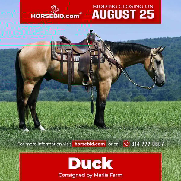 ⭐️ 𝐀𝐔𝐆𝐔𝐒𝐓 𝓐𝓵𝓵 𝓢𝓽𝓪𝓻 𝓛𝓲𝓷𝓮𝓾𝓹 ⭐️ Happening now thru MONDAY | AUGUST 25th - Available EXCLUSIVELY on HorseBid's website! For more details and to register visit: www.Horsebid.com CONSIGNOR CONTACT: Marlis Farm 814 777 0607 LOCATION: Rebersburg pa BREED: Quarter horse REGISTERED: No COLOR: Buckskin HEIGHT: 15 AGE: 6 GENDER: Gelding If you want a pretty, gentle and well trained gelding that is safe for the whole family, take a look at this gelding we call Duck!! Duck is a 15hand 6yr old quarter horse gelding that is well trained in and out of the arena, he picks up both his leads and has a nice stop. He has a smooth walk, trot and canter and is soft in the bridle. Duck neckreins, sidepasses and yields to leg cues. Duck is a seasoned trail horse and will go over logs, through water and wherever you point his head. We have taken him on day ridesat national parks and ridden him down the main highway into town. We have used Duck to push cattle and check fences here on the farm and he never refuses whatever discipline you choose for him. We have used Duck for walk trot lessons in the arena and he does well with that because he does not easily get rattled or annoyed. My little boys can get him out and brush and lead him around the farm and Duck always takes care of them. We have also ridden him in english tack and does take a jump really well and seems to enjoy it. Duck does well inside or turned out in a mixed herd. He loads and unloads without a fuss. He stands to be tacked, mounted and to be bathed and shod. Duck has a sweet personality and is the first to meet you at the gate. I could go on and on about this phenomenal gelding . He sells safe, sound and ready to move into his forever home. For more information or to come meet him feel free to call Mark 814 777 0607, call only and leave a voicemail, (I cannot text). We can help arrange shipping anywhere!!