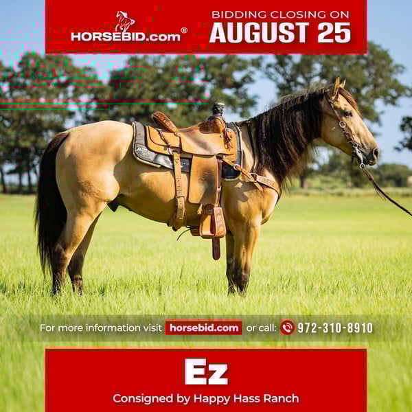 ⭐️ 𝐀𝐔𝐆𝐔𝐒𝐓 𝓐𝓵𝓵 𝓢𝓽𝓪𝓻 𝓛𝓲𝓷𝓮𝓾𝓹 ⭐️ Happening now thru MONDAY | AUGUST 25th - Available EXCLUSIVELY on HorseBid's website! For more details and to register visit: www.Horsebid.com CONSIGNOR CONTACT: Happy Hass Ranch 972-310-8910 LOCATION: Weatherford TX BREED: Qh REGISTERED: No COLOR: Buckskin HEIGHT: 15 AGE: 6 GENDER: Gelding Ez is a 6 yr old rope horse prospect with a long black mane and golden buckskin coat. He’s got the color and the temperament to turn heads. He has had 30 days of professional heeling training and is ready for his next owner to finish him their way! He is great in the box and is not phased or frazzled no matter how many runs you make. Ez is EASY and would be suited for a junior to finish. He has a scar on his back left hoof from an injury 2 years ago. The owners are releasing all vet records on EZ. He has never taken a step wrong and is ready for a job. Here’s your chance at a well minded, “EZ” guy whose flash will get you noticed.