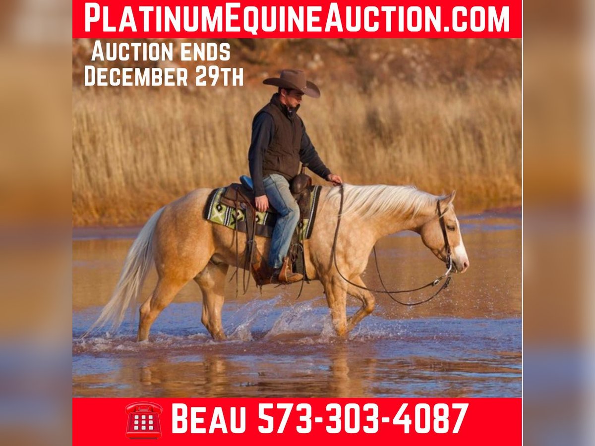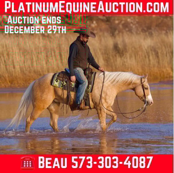 ONLINE AUCTION Place your bids at www.PlatinumEquineAuction.com Starting Bid $3500 Auction ends December 29th, 2024 Need a new saddle? Check out White Rock Saddles on our website or Facebook! A Whiskey Bootlegger is a 2020 model AQHA palomino gelding that stands 15 hands tall with an impeccable pedigree and versatile training to back it up. Sired by the great Whizkey N Diamonds, a proven producer in the reining industry, this gelding carries the genetic potential to excel in multiple disciplines. With his striking golden coat and strong, correct conformation, he is not only an eye-catcher but also built to perform. At just four years old, he is at a prime age to develop further in your chosen direction. With 16 months of professional reining training, this gelding is well-versed in the fundamentals of high-level performance. He is soft in the bridle, responsive to leg cues, and exhibits excellent stop, spin, and rollback mechanics. While he could easily be put back into the reining show pen, his foundation also makes him a natural candidate for ranch versatility or ranch riding events. His balanced gaits, surefootedness, and calm demeanor make him a pleasure to ride, whether in the arena or on the trail. Beyond his performance capabilities, this gelding is a true family horse. Gentle and kind-hearted, he has been ridden by riders of all ages and experience levels, making him a safe and enjoyable partner. He has been trail ridden extensively across the country, showcasing his reliability in diverse environments and his willingness to tackle new challenges. Whether you’re crossing streams, navigating wooded trails, or riding through open pastures, this gelding is steady, trustworthy, and eager to please. In addition to his versatility under saddle, this gelding is simply a joy to be around. He has a calm and personable demeanor that makes him a barn favorite. Easy to handle, load, and haul, he adapts well to new situations and settles quickly in unfamiliar surroundings. Whether you’re looking for a competition partner, a dependable ranch horse, or a family-friendly trail mount, this gelding is a well-rounded option with the training, temperament, and pedigree to excel. For more info please call or text Broken S Equine Beau 573-303-4087. ONLINE AUCTION Place your bids at www.PlatinumEquineAuction.com Starting Bid $3500 Auction ends December 29th, 2024 Need a new saddle? Check out White Rock Saddles on our website or Facebook!