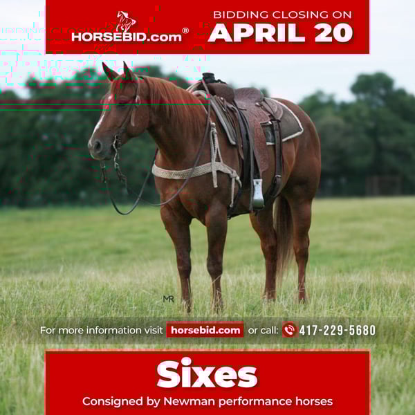 ⚜️𝐭𝐡𝐞 𝓔𝓵𝓲𝓽𝓮 𝐒𝐩𝐫𝐢𝐧𝐠 𝐂𝐥𝐚𝐬𝐬𝐢𝐜⚜️ Happening now thru MONDAY | APRIL 20th - Available EXCLUSIVELY on HorseBid's website! For more details and to register visit: www.Horsebid.com CONSIGNOR CONTACT: Newman performance horses 417-229-5680 LOCATION: Verona, MO BREED: AQHA REGISTERED: Yes REGISTERED NAME: KING COUNTY PICK COLOR: Sorrel HEIGHT: 15 AGE: 6 GENDER: Gelding “King County Pick” is an own son of the late Sixes Pick a legend from the famous Four Sixes ranch he is packing the legendary brand from 6666! He is a cool ranch horse that is solid and sure footed outside with enough heart and try to last all day. Sixes is great to sort and gather on, and frequently used for early morning shipping. Sixes rides one handed in and out of the arena, he catches both leads and is smooth as glass. He is a finished head horse, quite in the box, plenty of run and rate, and has a big move across the pen. He rides very well either alone or in a group. If you are just a weekend rider who wants to catch a horse Saturday and Sunday and go have fun he is your horse. He’s smooth, easy traveling, and a beautiful mover. Whether it be dragging calves to the fire or packing you through rough rocky terrain Sixes is the go too horse. He is no stranger to a long days work either he has been used in the feedlots pulling and sorting cattle along with being used outside on a cow operation prowling and checking fence. Sixes is Riata eligible.