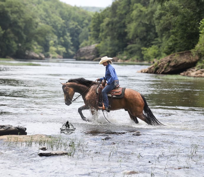 Ariat is consigned to the Best Of The West Horse Sale in Gladstone, NJ on September 26-27th. You can bid online or bid in person. There is a preview day before the sale or you can come ride him prior to the sale in Mt. Vernon, KY. Ariat is a brand that is comfortable, built to last and looks nice… just like the boots this Ariat is much the same! He is one classy looking guy! Not only does he look cool, he has all of the other boxes checked as well… he is Mr. Personality, as friendly as they come, loves attention and is very calm natured. From standing patiently for the kids to braid him to getting scrubbed from head to tail in the washbay, Ariat loves every moment with his people. Ariat has been ridden by every member of our family all the way down to our 7 year old. He is the type of horse that will take care of your grandma, the kids or random guests that show up. Ariat has been ridden down the highways, we have had in town and even though the bank drive-thru and he is traffic safe. He is a nice mover as he has a smooth trot, a VERY VERY nice easy to set lope, a good stop, turns a circle both ways and backs with ease! Ariat is great on trails and he will cross creeks, ditches, logs and navigate rough rocky areas. He has been exposed to all kinds of wildlife such as deer or turkey and will go anywhere that he is asked too. He has been ridden many miles in the mountains and encountered every obstacle possible on the trail. He has carried the kids up or down even the steepest slopes, across deep creeks, over downed trees, and over all types of rough terrain while still being sure footed. He has been ridden around cattle and used a couple of brandings to drag calves. Ariat also rides English and is talented at going over the jumps. He is steady coming into them, careful when landing and shows great form. In addition to riding, Ariat has been driven down the highways and worked on the farm as well. If you need a horse that can do anything from ranch work to trails, that can go over the rails or just hook up in a cart and go for a Sunday afternoon stroll through town… this is a horse that your family will cherish for years to come! Call 606-308-2461 with any questions.