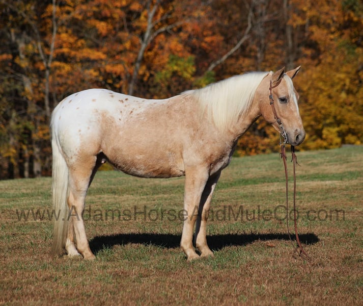 This horse sells in Cannon Falls, MN on February 1st and is consigned to www.NorthStarHorseSale.com you can bid online, bid in person and come preview each horse and ride them yourself before bidding. Shipping is available anywhere in the USA. $5000 starting bid, all horses sell sound. Trash those X-Boxes, Playstations or other video game consoles, kids don’t need to be glued to a TV… Kids need a horse like Pecos Bill!!! Take a look at the coolest little appaloosa horse that you will see! He has it all going for him from that beautiful palomino color, to that pretty LONG mane and tail and don’t forget about that sweet little lope! Pecos Bill is a 5 year old gelding that is standing around 13.3hh. All fall and winter long Pecos Bill has been one of our 6 year old daughters horse and she has trail ridden him, took him camping, had around the ranch and pushed cows with him. Pecos Bill has been the perfect horse for her! Pecos Bill is plenty stout enough to carry an adult as Mom has taken Pecos Bill out on the ranch, where she has pasture roped and doctored sick ones, herded cattle and the kids have ridden down the trails almost daily! Pecos Bill will cross creeks, ditches, logs and navigate rough rocky areas. He has a nice walk, smooth jog, a good slow lope, he reins around and backs as well! He has been exposed to all kinds of wildlife and will go anywhere that he is asked too. He has been ridden many miles in the mountains of Eastern Kentucky and encountered every obstacle possible on the trail. He will go up or down even the steepest slopes, across deep creeks, over downed trees, and over all types of rough terrain while still being sure footed. Pecos Bill will be a family favorite for years to come! Call 606-308-2461 for more info.
