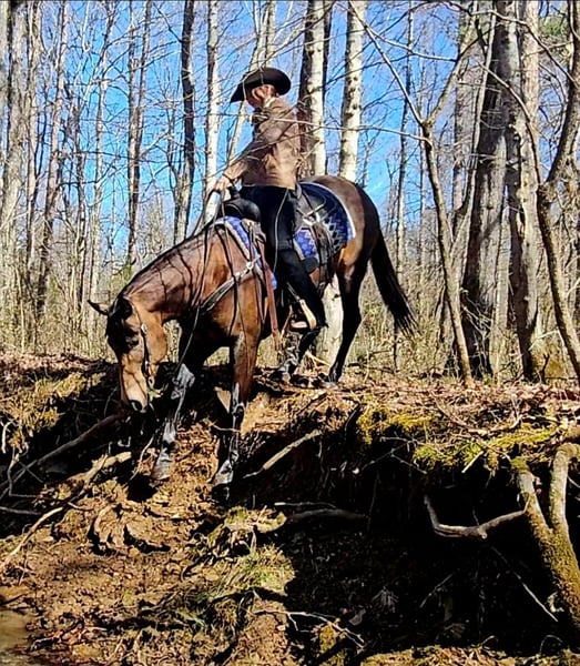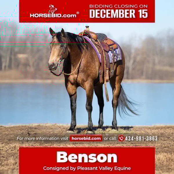 🎄𝐓𝐇𝐄 𝑯𝒐𝒍𝒊𝒅𝒂𝒚 𝐂𝐋𝐀𝐒𝐒𝐈𝐂🎄 Happening now thru MONDAY | DECEMBER 15th - Available EXCLUSIVELY on HorseBid's website! For more details and to register visit: www.Horsebid.com CONSIGNOR CONTACT: Pleasant Valley Equine 434-981-3863 LOCATION: Robards, KY BREED: Quarter Horse REGISTERED: Yes REGISTERED NAME: Paddy's Gin Sahara jw COLOR: Sooty Buckskin HEIGHT: 15 AGE: 6 GENDER: Gelding Benson is an outstanding gelding that you’ve been looked for your entire life. He’s definitely the Rolls Royce in horse flesh. Benson is a 6 year old, 15 hand, 1100lb, SOOTY BUCKSKIN. Benson has been extensively trail ridden all over Kentucky and Illinois; from haul in day rides to weeks at a time camping trips. He will stand on the picket line or tied to the trailer for hours at a time. He will cross obstacles on the trail without any hesitation: water, ditches, and logs. Benson will ride with large groups or out on his own. He is just happy to be with you. Benson has also been used to pony babies in the training barn, tracking & roping cattle out in the feild, and has been through several obstacle courses. Benson has been ridden western, english, and bareback with just a halter. Benson is very versatile inside or outside the arena. Whether it be letting the kids show him in the county shows english/western or taking a long relaxing trail ride he is your man. He is also traffic safe if you want to take a stroll through town and ride in parades. Benson loves to be groomed. He has the sweet personality everyone looking for. He will stand for hours while you brush and braid his mane and tail. He is 100% family safe from beginners to seasoned riders or anyone in between. He will kindly drop his head to make bridling easy. With just a snap of your finger, Benson will side pass to a picnic table, truck bed, log, or trailer fender to make mounting easy Benson sells 100% sound & UTD on vaccinations & dental. Benson comes with a certified letter of health from the vet and clean radiographic. Buy with confidence. Don’t miss this diamond. For more information call Jessica at 434-981-3863