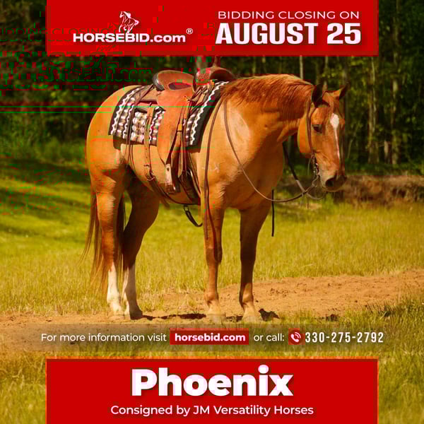 ⭐️ 𝐀𝐔𝐆𝐔𝐒𝐓 𝓐𝓵𝓵 𝓢𝓽𝓪𝓻 𝓛𝓲𝓷𝓮𝓾𝓹 ⭐️ Happening now thru MONDAY | AUGUST 25th - Available EXCLUSIVELY on HorseBid's website! For more details and to register visit: www.Horsebid.com CONSIGNOR CONTACT: JM Versatility Horses 330-275-2792 LOCATION: Fresno, OH BREED: Quarter Horse REGISTERED: No COLOR: Dun HEIGHT: 15.2 AGE: 7 GENDER: Gelding Phoenix is a 7 yr. Old dun gelding, 15.2 hands tall . He is a talented, gentle and quiet yet athletic & smart with a willingness to work. His versatility and adaptability has earned him a reputation as a reliable and trustworthy partner in any ranching situation. Phoenix Is known for his great demeanor and willingness to please, he is a trusted partner for riders of all skill levels. Whether doing ranch work, in the arena, or out on the trails Phoenix continues to impress with exceptional performance and undeniable presence. Phoenix has a great handle, lopes beautiful circles, has a smooth flowing trot. He is soft in the bridle, moves off your legs and is just an easy riding horse. He has the easy going demeanor that makes him perfect for the novice rider yet a ton of fun the seasoned rancher, or trail rider. Phoenix showcases the perfect blend of athleticism, intelligence and versatility. We have rode him for miles and miles on the trails.. He is willing to do anything you ask, goes where he’s pointed . Out on trail rides he’s happy to ride in a group or he will ride out alone. He is not buddy sour or barn sour. We have spent many hours riding him by himself and he is confident everywhere you take him. We have given Phoenix time off and saddled him up and rode him off with No issues at all, just as quiet and solid as if it was a warm summer day. Phoenix is very friendly, he meets you at the gate and enjoys being around people. He wants to be your friend and is happy to be wherever you are. Phoenix gets along well in a mixed herd or he is happy by himself in a box stall. He loads in, backs out of the trailer and hauls well. Phoenix is good for the vet and stands well for the farrier. He is up to date on worming, dental and farrier. We welcome you to do your own PPE. We also welcome you to come to the farm and meet Phoenix . He has a current coggins and all paperwork will be order for him to travel to his new home. We also are glad to help arrange transportation as we have a list of reliable haulers we can coordinate with. For more information contact JM Versatility Horses @ 330-275-2792