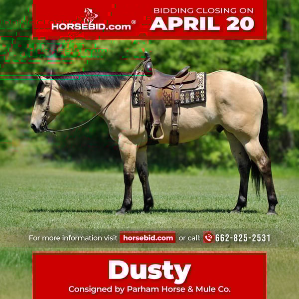 ⚜️𝐭𝐡𝐞 𝓔𝓵𝓲𝓽𝓮 𝐒𝐩𝐫𝐢𝐧𝐠 𝐂𝐥𝐚𝐬𝐬𝐢𝐜⚜️ Happening now thru MONDAY | APRIL 20th - Available EXCLUSIVELY on HorseBid's website! For more details and to register visit: www.Horsebid.com CONSIGNOR CONTACT: Parham Horse & Mule Co. 662-825-2531 LOCATION: Amory MS BREED: American Quarter Horse REGISTERED: Yes REGISTERED NAME: JNP DUSTY COWBOY COLOR: Buckskin HEIGHT: 16 AGE: 7 GENDER: Gelding JNP Dusty Cowboy (“Dusty”) is a stunning 7-year-old registered Quarter Horse gelding standing a solid 16 hands tall. Photos simply don’t do justice to his size, presence, and overall beauty—you have to see him in person to truly appreciate him. Dusty’s temperament is just as impressive as his looks. He is exceptionally gentle, people-oriented, and truly enjoys attention. He’s the kind of horse that meets you at the gate and makes every visit to the barn something to look forward to. He has been extensively trail ridden and is a steady, confidence-building partner. Dusty travels at a smooth, comfortable pace and is not spooky, making him a relaxing and enjoyable ride. He has been hauled to camping trips in the National Forest and handles new environments with ease. He confidently crosses all trail obstacles and has a solid one-hand neck rein. In the arena, Dusty is equally reliable. He has been ridden extensively English and has helped teach many riders. He picks up both leads correctly, carries himself well, and has a smooth, easy trot. He stands quietly in cross ties for grooming, shoeing, and bathing, and is a pleasure to handle on the ground. Dusty is a versatile, dependable gelding suitable for riders of all experience levels. Horses like him are hard to come by—he truly is a once-in-a-lifetime partner. Pre-purchase exams (PPE) are welcome, and you are encouraged to come ride him both in the arena and out on the trails prior to bidding. Please feel free to reach out with any questions about Dusty.
