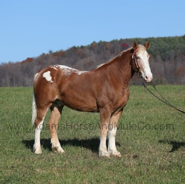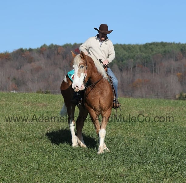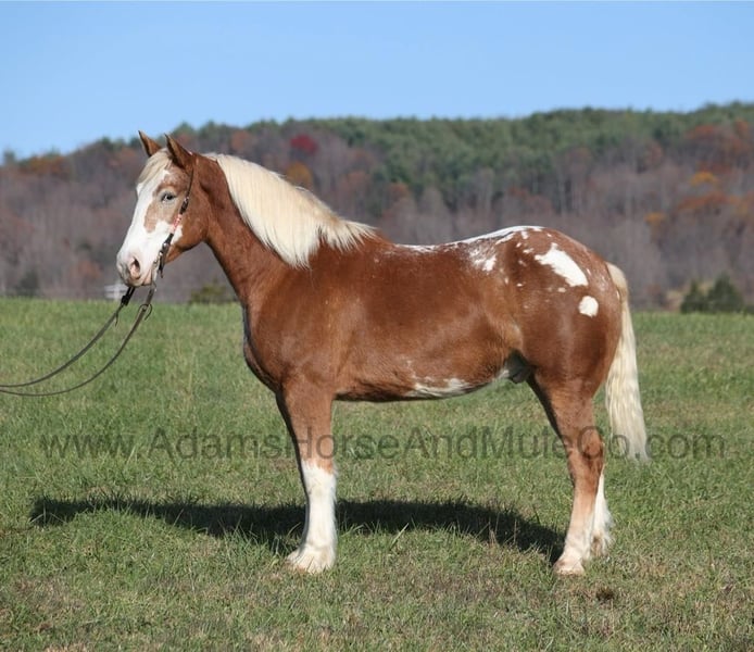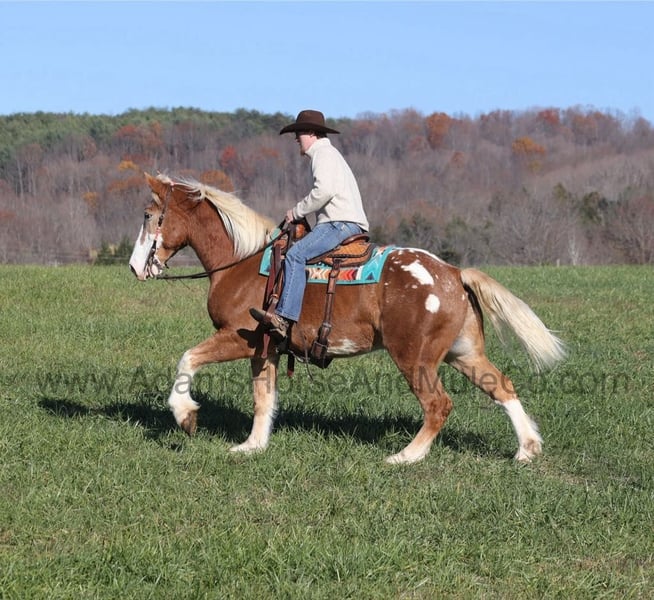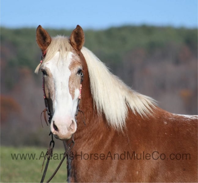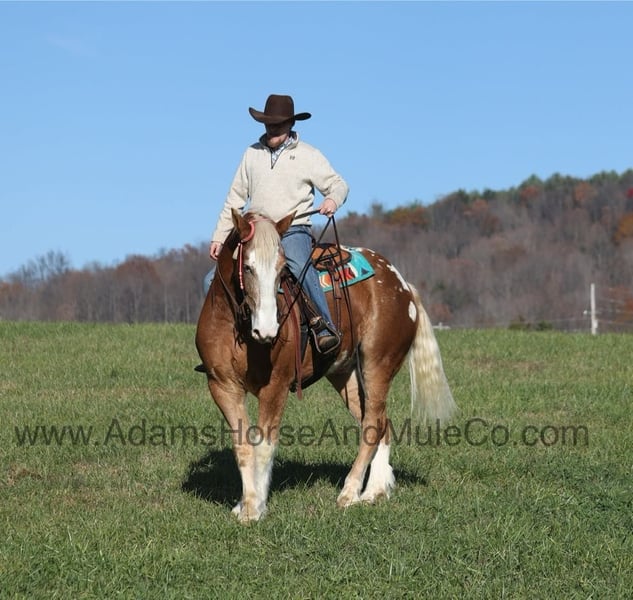 Patch is one of the most unique Draftcross geldings that have had the pleasure to own! He is a sorrel flax mane and tail blanketed Appaloosa that is weighing in around 1400lbs and stands aroujnd 16.2H! He is 6 years old and is very well built. Patch has been ridden around the ranch, checked cows and rode fences. He is a slow and laid back type of horse that will just ease along down the trails with no hesitation. He is a horse that the whole famliy will love and one that will help build everyone’s confidince levels! He has been camping in several states and has been ridden by all ages of beginners. When out on the ranch or going down the trails he will cross creeks, ditches, logs and navigate rough rocky areas. He is safe in traffic safe whether that be trucks or cars. He has a nice jog, his lope is slow, collected and very easy to set as he lopes nice circles! He has been exposed to all kinds of wildlife such as deer or turkey. If you are a big ol feller, a lil bitty lady or a combination of each… Patch will take care of you! Feel free to call Eric 606-308-2461 with any questions! Go to visit our website for more pics and a video www.AdamsHorseAndMuleCo.com AHAMC has been in the horse business and sold horses over the internet since 2005. We have a long track record of success with hundreds of happy customers. We work hard to match riders with the correct horses and specialize in beginner safe, family friendly horses that have been used and checked out by our family! We can set up transportation anywhere in the US and look forward to working with you.