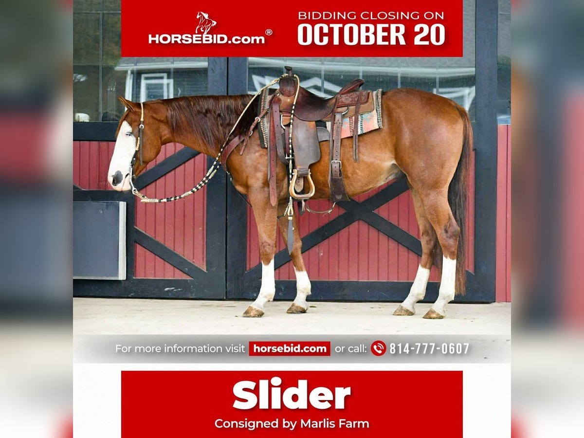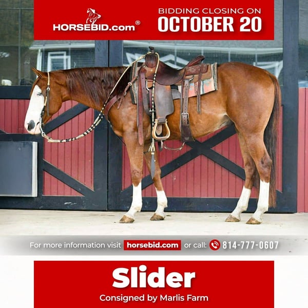 ♦️ 𝐭𝐡𝐞 𝐀𝐌𝐄𝐑𝐈𝐂𝐀𝐍 𝓕𝓪𝓵𝓵 𝓒𝓵𝓪𝓼𝓼𝓲𝓬 ♦️ Happening now thru MONDAY | OCTOBER 20th - Available EXCLUSIVELY on HorseBid's website! For more details and to register visit: www.Horsebid.com CONSIGNOR CONTACT: Marlis Farm 814-777-0607 LOCATION: Rebersburg, Pa BREED: QH REGISTERED: No COLOR: Sorrel HEIGHT: 15 AGE: 7 GENDER: Gelding Slider is a 7 Year Old Flashy Sorrel With Lots of Chrome Gelding. Wow Check Him Out!! Slider is a super cool horse. He is in fact one of the barn favorites!! Whoever buys him will absolutely love him and he will be greatly missed here. He has had reining training and is super good broke to ride. From the ranch to the arena to the trail Slider is solid in all aspects. He has lots of training and is very seasoned and been there done that type of a horse that is reliable and dependable. If your a beginner or a timid rider you will feel safe riding him. Hes that quiet and gentle. My kids can handle him on the ground and ride him. Horses like slider are truely super hard to find and Slider is a one of a kind type of horse. Great ground manners and easy to catch. He loves attention and is the kind of horse that is easy to bond with. You can go out and do any job you want on slider and most importantly you can have a stress free ride and feel safe on him. Dont miss out on this super cool horse. We can help arrange delivery anywhere in the United States. Call Mark at 814-777-0607 . Please Call because i can not receive texts. Thank You and God Bless