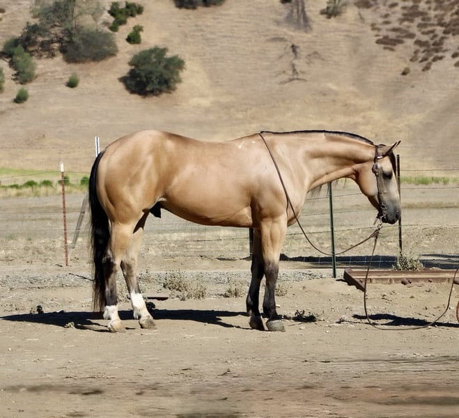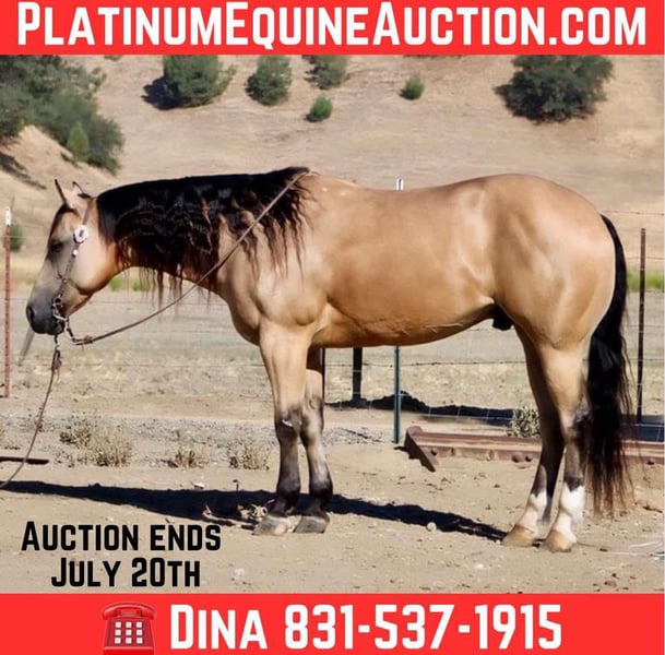 ONLINE AUCTION Place your bids at www.PlatinumEquineAuction.com Starting Bid $3500 Auction ends July 20th 2025 Need a new saddle? Check out White Rock Saddles on our website or Facebook 24k-Mr Gold Nugget is the Ultimate Buckskin Dream Horse! Meet 24k-Mr Gold Nugget a stunning, drop-dead gorgeous buckskin 7 years old and 14.3 hands tall this gelding checks all the boxes: safe, reliable, calm, and absolutely cool. He’s as trustworthy as they come and one of the easiest horses to ride. Quiet and level-headed, this gentle soul has the kind of disposition that makes him a perfect family favorite, yet he’s versatile and athletic enough to tackle any challenge you throw his way. Whether you’re hitting the trails or stepping into the arena, 24k-Nugget is always ready. He confidently navigates brush, logs, and deep creek crossings. He’s been used for roping, doctoring, and branding cattle, making him an awesome ranch partner. He has the potential to excel in the roping pen—whether as a breakaway or heel horse. This gelding is a smooth mover with beautiful circles, a soft stop, and an easy back-up. He’s well-exposed and unbothered by the unexpected—he’s seen bridges, tires, pool noodles, and more. He’s been to town, and couldn’t care less about honking horns, buzzing traffic, or semis. We’ve even taken him to the beach—he loves the waves and the feeling of sand in his hair! 24k- Nugget is the kind of horse people dream of owning. He’s confident riding out alone or in a group, handles time off like a pro, and is a joy to groom, clip, and tack up. He hauls like a champ, settles in anywhere, and ties quietly for overnight camping trips. This is the horse you’ll be proud to own—safe, stunning, and ready to make countless memories with you. Located in Paicines, CA. Contact Dina at Longhorn Ranch 831-537-1915 to meet this handsome buckskin! ONLINE AUCTION Place your bids at www.PlatinumEquineAuction.com Starting Bid $3500 Auction ends July 20th 2025 Need a new saddle? Check out White Rock Saddles on our website or Facebook