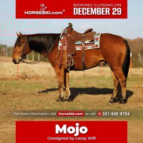⚜️𝐓𝐇𝐄 𝓗𝓮𝓻𝓲𝓽𝓪𝓰𝓮 𝐖𝐢𝐧𝐭𝐞𝐫 𝓒𝓵𝓪𝓼𝓼𝓲𝓬⚜️ Happening now thru MONDAY | DECEMBER 29th - Available EXCLUSIVELY on HorseBid's website! For more details and to register visit: www.Horsebid.com CONSIGNOR CONTACT: Lacey Wilf 501-940-8704 LOCATION: Quitman AR BREED: Quarter Horse REGISTERED: Yes REGISTERED NAME: ZANS TWO ID HICKORY COLOR: Bay HEIGHT: 14.2 AGE: 8 GENDER: Gelding Mojo is a 2017 model bay gelding with a heart as soft as his eye and a disposition you’ll fall for instantly. Standing 14.2 and built like a tank, he’s compact, sturdy, and carries the kind of shape and substance everyone appreciates in a using gelding. He’s the kind that greets you with quiet confidence, stands patiently for whatever you need, and carries a naturally kind, agreeable presence that makes him an easy favorite in any barn. Out on the trail, Mojo is as steady as they come. He moves through water, timber, and uneven country with a sure, thoughtful step, never rushing and never questioning where he’s pointed. Busy roads, passing vehicles, barking dogs, or farm machinery don’t bother him in the slightest—he takes the world in with a level, relaxed mindset that keeps every ride comfortable and predictable. Whether he’s leading the group or cruising along at the back, Mojo stays the same: honest, composed, and dependable. In the arena, he offers a smooth, uncomplicated ride with a naturally balanced way of traveling. He stays soft in the bridle, easy between the reins, and carries himself with a quiet willingness that suits riders who appreciate a horse that makes things simple. He’s responsive without being reactive, and forward without ever feeling hot—a rare combination that makes him truly enjoyable. Mojo has also gained real, practical experience at the stockyards—comfortable sorting, moving cattle, and working alleys with a quiet mind. He handles pressure and movement with maturity, staying tuned in without getting worked up. His ground manners are exactly what you’d hope for in a gelding of his caliber. Mojo is polite to saddle, stands well for the farrier, leads with respect, and loads and hauls with no issue. He pastures well with others—no drama, no trouble—and he transitions effortlessly into new surroundings. His pedigree shows exactly why he’s built the way he is—carrying the consistent minds and using-horse qualities of Zan Par Jinx, Rich Holly Jinx, and Doc’s Hickory bloodlines. That heritage shows through in his softness, trainability, and steady work ethic. If your program could use a sweet-natured, dependable gelding with real-world experience and a personality that makes every day better, Mojo brings all of that—and more—to the table.