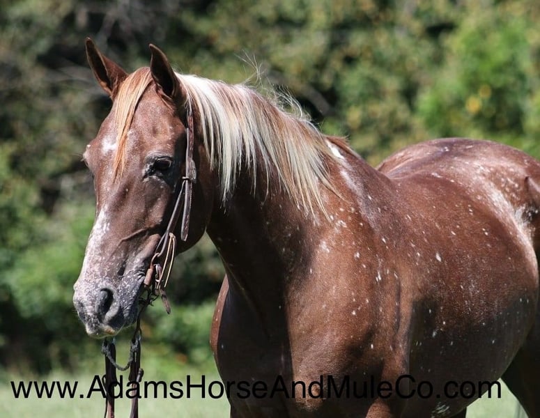Go to www.AdamsHorseAndMuleCo.com for more pics and a video. AHAMC has been in the horse business and sold horses over the internet since 2005. We have a long track record of success with hundreds of happy customers. We work hard to match riders with the correct horses and specialize in beginner safe, family friendly horses that have been used and checked out by our family! I’ll bet you have not seen many like Astro before? Astro is an appaloosa paint gelding with snowflake spots all over with 4 big stockings and a white tail. He is standing around 15h and is 7 years old. He is friendly with lots of personality! Astro is a horse that the whole family can ride and enjoy! He has been ridden down the highways and he is traffic safe as well. Astro is great on trails and he will cross creeks, ditches, logs and navigate rough rocky areas. He has a smooth jog, a nice easy to set lope, a good stop, turns several circles both ways and backs with ease! He has been exposed to all kinds of wildlife such as deer or turkey or other animals like cows or dogs and will go anywhere that he is asked too. He has been rode many miles in the mountains of Eastern Kentucky and encountered every obstacle possible on the trail. He will go up or down even the steepest slopes, across deep creeks, over downed trees, and over all types of rough terrain while still being sure footed. Astro is not cinchy, cold backed, does not crib or weave. Astro is a once in a lifetime type of horse!!! Feel free to call Eric 606-308-2461 with any questions.