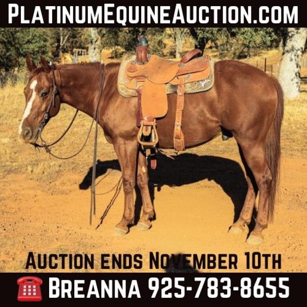 ONLINE AUCTION Place your bids at www.PlatinumEquineAuction.com Starting Bid $3500 Auction ends November 10th, 2024 Need a new saddle? Check out White Rock Saddles on our website or Facebook! Meet Bandito, a stunning 7-year-old, 15-hand copper red gelding that is as versatile as he is beautiful. This boy is the total package—a smooth and elegant mover with an adventurous spirit that will take you anywhere you want to go. With his graceful movement and fluidity, Bandito is a horse who turns heads whether on the trail or in the show ring. Bandito is an experienced trail horse who’s always up for an adventure. He’s proven himself time and again on all types of terrain, tackling water crossings, bridges, logs, steep hills, and rocky paths with confidence and ease. He’s a steady and reliable partner through it all, keeping his cool no matter what obstacles come his way. Whether you’re planning a quiet ride through the woods or exploring new, rugged terrain, Bandito will get you there smoothly. Bandito isn’t just a trail horse—he’s also well-versed in arena work. He knows his leads, has a solid stop, backs up, side passes, spins, and moves like a true professional. His fluid gaits make him a dream to ride. Bandito is no stranger to obstacles and challenges, whether it’s on the trail or in the arena. He’s confidently handled everything from water, logs, and uneven terrain to man-made obstacles like gates, tarps, and more. His laid-back nature extends beyond the trails—Bandito is used to loud noises, smoke, wildlife, dogs, tractors, ATVs, and heavy equipment. He’s also been rode around town and in parades through the whole city life. He’s the kind of horse that keeps his cool even in chaotic environments, making him an ideal companion for riders who encounter a lot of external distractions. At just 7 years old, Bandito is still young with plenty of potential left to explore. His versatility means he could go in any direction you want, whether that’s continuing as an exceptional trail horse or moving into more specialized disciplines like ranch work, roping, barrels/poles, jumping, or competitive trail riding. Because of his young age and with his responsiveness Bandito would thrive best in a more intermediate home. He stands tied for baths, saddling, farrier, grooming. He loads in the trailer well. He is UTD on teeth,shots,worming, shoes. Don’t miss out on Bandito the copper penny. Please contact Kamryn at KW Ranch 530-852-2032 Located in Pleasant Grove, CA. ONLINE AUCTION Place your bids at www.PlatinumEquineAuction.com Starting Bid $3500 Auction ends November 10th, 2024 Need a new saddle? Check out White Rock Saddles on our website or Facebook!