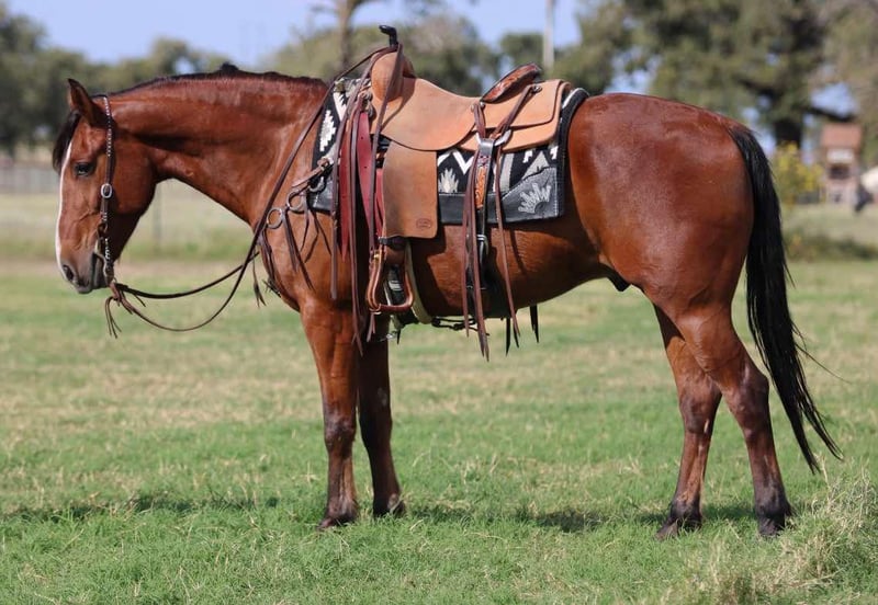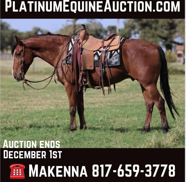 ONLINE AUCTION Place your bids at www.PlatinumEquineAuction.com Starting Bid $3500 Auction ends December 1st, 2024 Need a new saddle? Check out White Rock Saddles on our website or Facebook! Tango has a heart of gold and is as quiet one could hope to find. He always wants to be your best friend, and is sucker for love and attention. He is a grade 7 year old gelding standing at 15.1hh. Tango is quiet to be around, good with his feet, and a gentleman on the ground. He’s been exposed to almost anything you can imagine including whips, tarps, flags, ropes, or whatever else might look strange to a horse. He wants to ride slow, and relaxed. He picks up both leads nicely and lopes off with ease. Above all, Tango really shines, and excels being out on the trails. He’s calm, steady, and quiet handling himself in rough country, maneuvering with ease over bridges, bogs, crossing water, etc… Tango has been ridden by all levels of riders, and is forgiving of mistakes made by those who are new, helping to build their confidence. He would really go far in trail versatility classes or would help you to capture the eyes emotions carrying a flag. Whether you’re on the ranch, and in the arena, everyone notices him by his looks, and quiet demeanor. He is the best, and one of the favorites in the barn. Tango is located in Lipan Texas.We are more than willing to help with all shipping needs, we ship all over the country as well as Hawaii and Canada. For more information please call Makenna Hartzel 817-659-3778. ONLINE AUCTION Place your bids at www.PlatinumEquineAuction.com Starting Bid $3500 Auction ends December 1st, 2024 Need a new saddle? Check out White Rock Saddles on our website or Facebook!