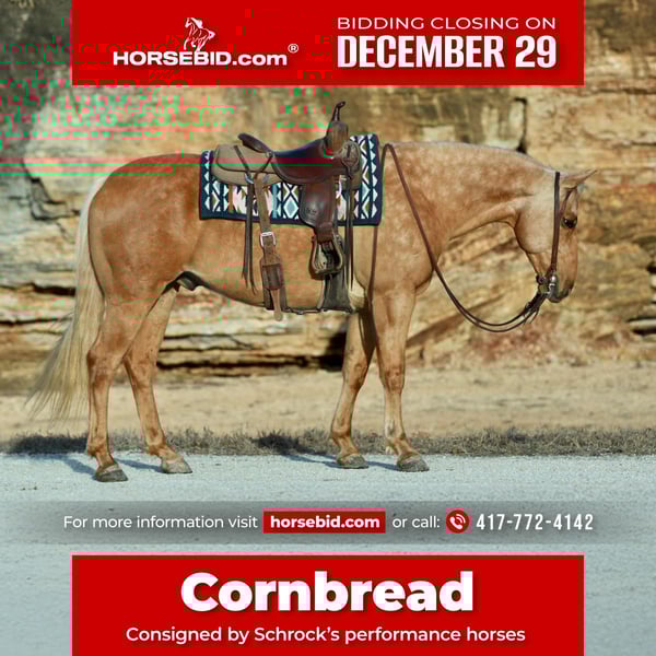 ⚜️ 𝓗𝓮𝓻𝓲𝓽𝓪𝓰𝓮 𝐖𝐢𝐧𝐭𝐞𝐫 𝓒𝓵𝓪𝓼𝓼𝓲𝓬⚜️ Happening now thru MONDAY | DECEMBER 29th - Available EXCLUSIVELY on HorseBid's website! For more details and to register visit: www.Horsebid.com CONSIGNOR CONTACT: Schrock’s performance horses 417-772-4142 LOCATION: Purdy, MO BREED: Quarter horse REGISTERED: No COLOR: Palo HEIGHT: 15.3 AGE: 8 GENDER: Gelding Cornbread is a 8 year old QH gelding. He stands right at 15.3 hands, built like an absolute TANK! But you know what they say, “pretty is, what pretty does”! Cornbread is broke & rides right. He neck reins, moves off leg pressure & picks up his leads. Moves through his gaits with a smooth stop & a nice handle. Very easy to ride & extremely gentle. Absolutely no nonsense with this guy! Nothing phases this handsome young gelding, from traffic in town to trail obstacles- he takes everything in stride. He is an awesome trail horse! Cornbread primary occupation has always involved COWS. He has experience in every aspect of ranch work. Been used at the feedlot. We have started roping the sled on him in the arena. He is quiet in the box and shows a lot of promise as a head or heel horse. He enjoys being groomed, he is a gentleman to be saddled, bridled and mounted. He will not rush you to get on or walk off until you cue him. Great to shoe, loads & will stand tied all day long! This gentle young gelding is sound, sane & ready to pick up the occupation of your choosing.