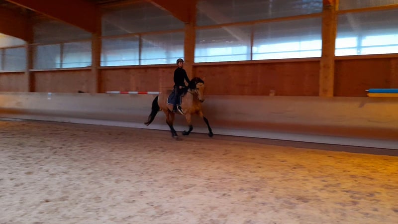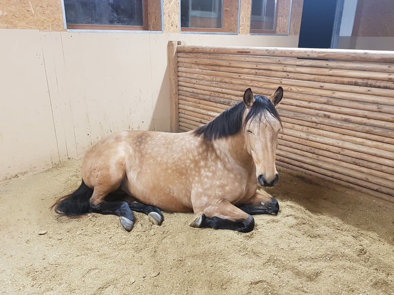 For sale is my charming purebred PRE mare from 2015. With her golden buckskin coat and a height of 165 cm, she is not only a real eye-catcher but also a loyal companion for leisure activities. My mare is absolutely friendly, likes other animals (is familiar with cats, dogs, chickens, goats, and cows), and gets along well with all horses - whether ponies or large horses, mares or geldings. She integrates effortlessly into the herd and will only be sold for open stall housing due to her social and lively nature. As she is typically Spanish and easy to gain weight, she requires regulated hay feeding and limited turnout. She is not a horse for 24/7 pasture and unlimited hay access! My mare is a very smart horse that learns quickly and especially enjoys and has potential in classical groundwork with the cavesson. The Spanish walk is her favorite lesson. She is ridden bitless and prefers to go out in the field. On field and forest paths, she is a dream - even alone, as she does not stick to other horses at all. She is always well-regulated in all gaits and does not rush off when heading back. However, she is unfortunately not road-safe and is particularly afraid of trucks, tractors, etc. Since we do not have anyone at the stable who goes out riding, I cannot practice this well - but with a confident companion horse, it would probably be manageable. My mare is well-trained but, as is typical for Spanish horses, very sensitive and delicate - therefore, she is not a horse for beginners or impatient/coarse individuals. Additionally, she is not a weight carrier. Unfortunately, my mare has a few health issues (which do not constitute the reason for sale!), so she will be sold as conditionally rideable. More details can be discussed personally. This is not a forced sale, and only with a right of first refusal/placement check. I would like a place for my mare as a family member, where she is loved and cared for as she is by me! The focus should not be on riding but rather on the relationship with the horse and engaging in gymnastic, health-promoting work. I look forward to friendly, seriously interested inquiries.