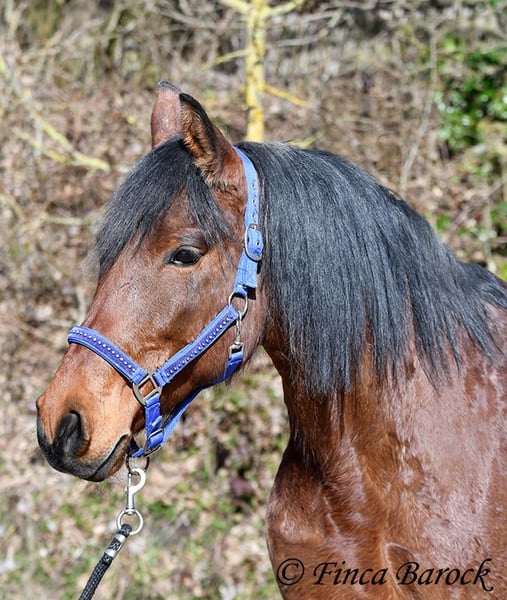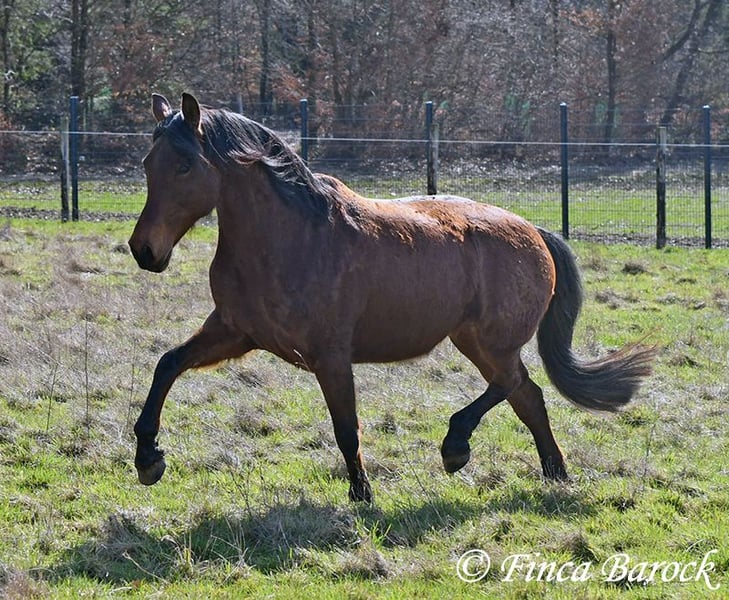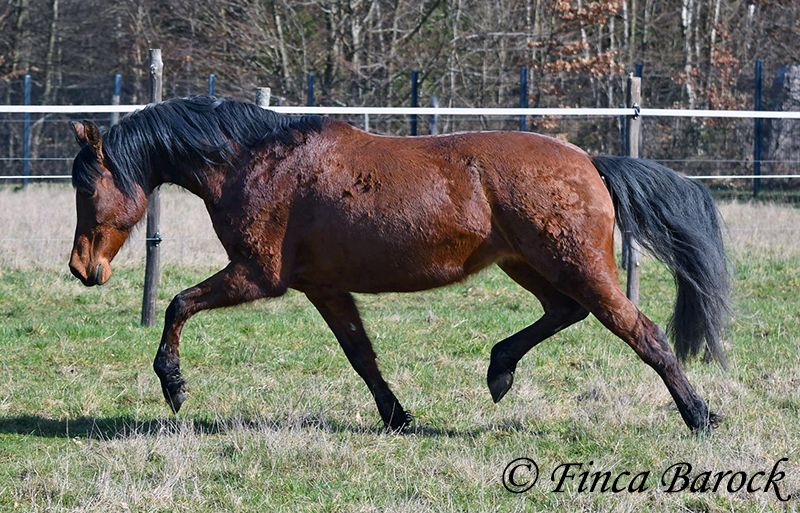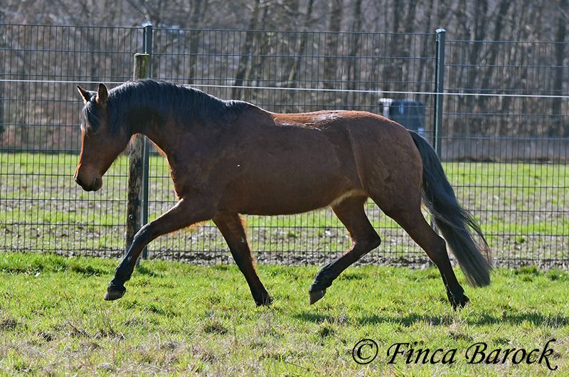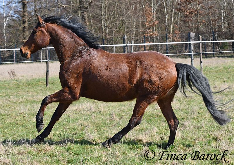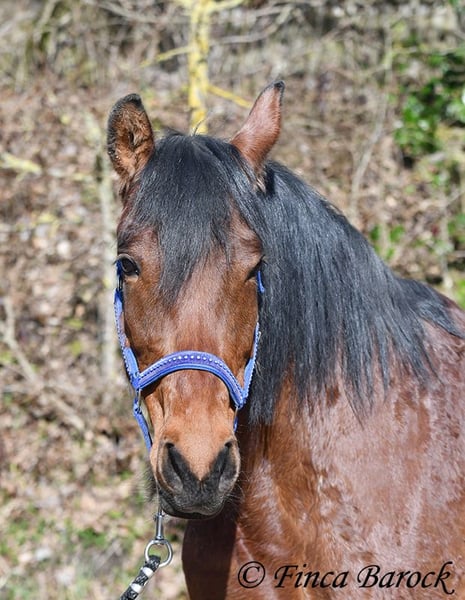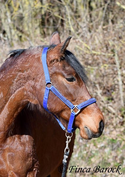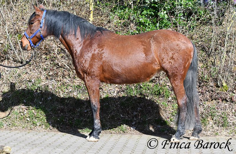 Rasse: Andalusier Name: Estrella Geschlecht: Stute Stockmaß: 158 cm Alter: 06.10.2012 Farbe: Braun Preis: 5000 € (zur Zeit) Vater: o. P. Mutter: o. P. Estrella, ist eine kompakte Stute mit wunderschönen Kopf und großen schwarzen Augen. Estrella war seit ihrem 2 Lebensjahr in einer Hand. Sie wurde vielseitig ausgebildet und kennt sehr viel. So ist sie in der Working Equitation sicher A geritten, L Angefangen. Sie kennt sehr viel Bodenarbeit, Arbeit an der Hand, Longe, Doppellonge und Freiarbeit. Sie geht an der Hand und unter dem Sattel Schulterherein, Travers, Renvers und Traverale. Estrella liebt Ausritte. Alleine kann Sie kurz nach fremden Sachen gucken, lässt sich hier aber souverän von Ihren Reiter überzeugen weiter zu gehen. Auch kennt Sie es das ein Handpferd mitgeht. Sie kennt ebenso das Reiten ohne Sattel oder auch mit Reitpad. Auch kleine Sprünge sind ihr nicht fremd. Grenfell kennt Sie die Arbeit mit Stangen (vom Boden und unter dem Reiter) und macht hier mit Freude mit. Unter dem Reiter zeigt Sie sich leichtrittig und reagiert zeitnah auf Reiterhilfen. Sie ist sehr sitzbequem und besonders ihre tolle Bergaufgaloppade ist hervorzuheben. Durch ihr feinfühliges Wesen braucht Estrella einen klaren Menschen. Hat Sie Ihren Menschen gefunden so geht Sie für diesen durch Dick und Dünn. Estrella hat MIM (PSSM2), Sie bekommt hier angepasstes Futter und ist damit gut eingestellt. Mit Estrella bekommt man ein erfahrendes Pferd mit vielseitiger Ausbildung, welche nur aus persönlichen Gründen zum Verkauf steht. Sie ist Herdenhaltung gewöhnt und kennt natürlich Gras. Estrella hat eine klinische Untersuchung. Kontakt: Finca Barock, Tel. 0173-696 31 81, 56291 Wiebelsheim