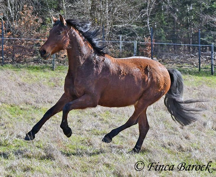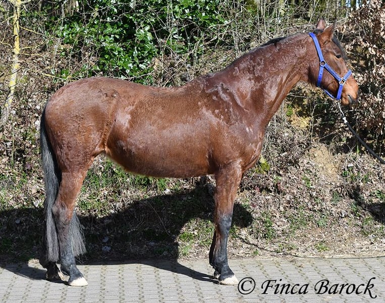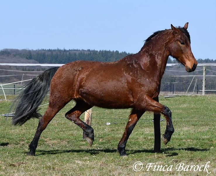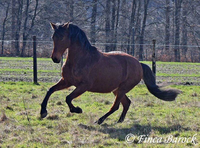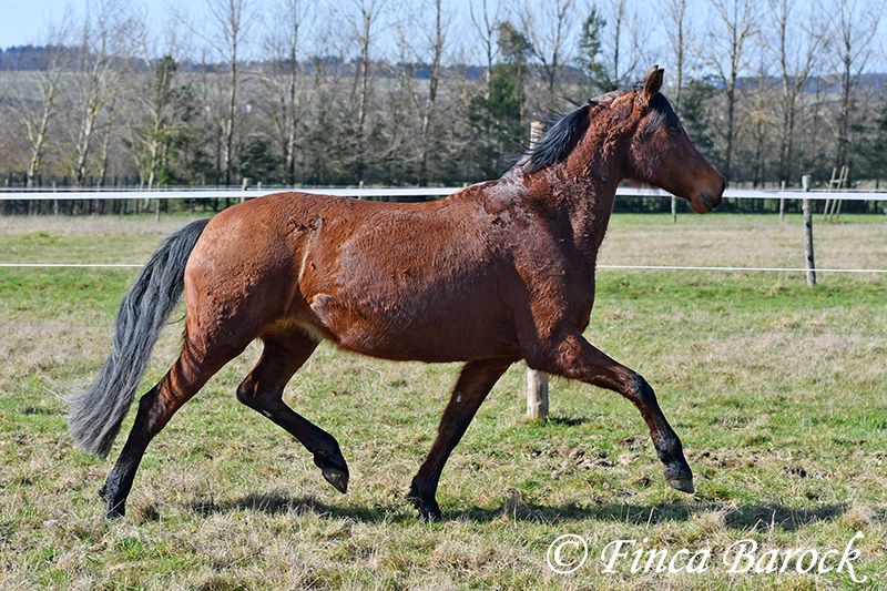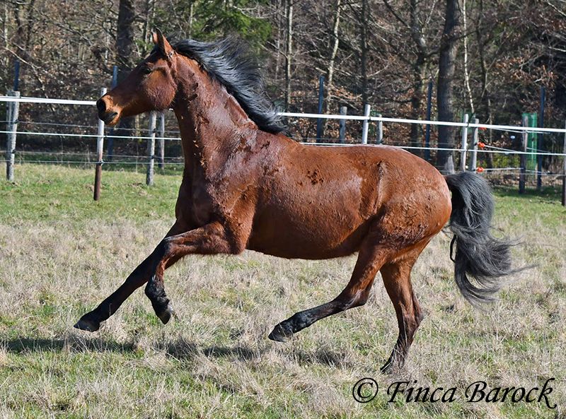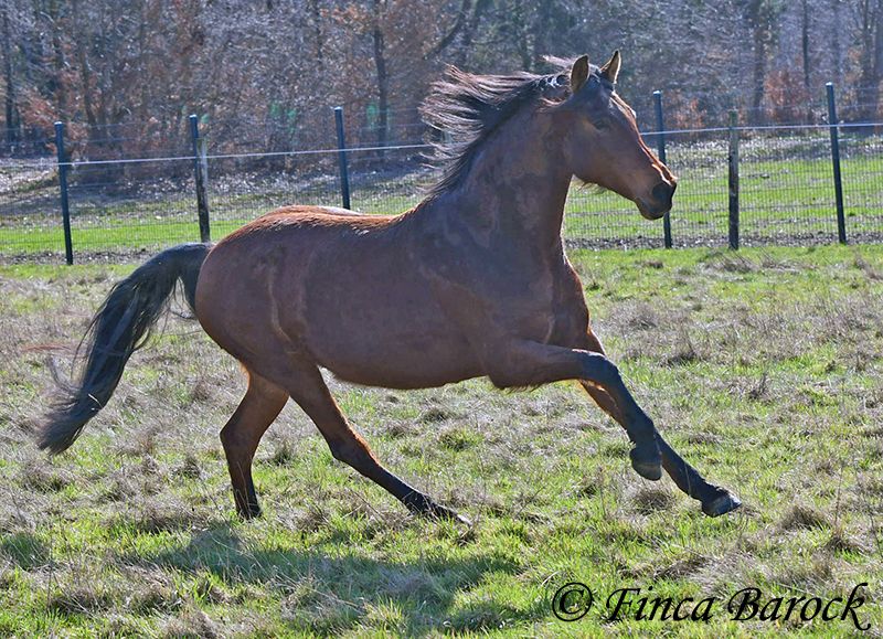 Rasse: Andalusier Name: Estrella Geschlecht: Stute Stockmaß: 158 cm Alter: 06.10.2012 Farbe: Braun Preis: 5000 € (zur Zeit) Vater: o. P. Mutter: o. P. Estrella, ist eine kompakte Stute mit wunderschönen Kopf und großen schwarzen Augen. Estrella war seit ihrem 2 Lebensjahr in einer Hand. Sie wurde vielseitig ausgebildet und kennt sehr viel. So ist sie in der Working Equitation sicher A geritten, L Angefangen. Sie kennt sehr viel Bodenarbeit, Arbeit an der Hand, Longe, Doppellonge und Freiarbeit. Sie geht an der Hand und unter dem Sattel Schulterherein, Travers, Renvers und Traverale. Estrella liebt Ausritte. Alleine kann Sie kurz nach fremden Sachen gucken, lässt sich hier aber souverän von Ihren Reiter überzeugen weiter zu gehen. Auch kennt Sie es das ein Handpferd mitgeht. Sie kennt ebenso das Reiten ohne Sattel oder auch mit Reitpad. Auch kleine Sprünge sind ihr nicht fremd. Grenfell kennt Sie die Arbeit mit Stangen (vom Boden und unter dem Reiter) und macht hier mit Freude mit. Unter dem Reiter zeigt Sie sich leichtrittig und reagiert zeitnah auf Reiterhilfen. Sie ist sehr sitzbequem und besonders ihre tolle Bergaufgaloppade ist hervorzuheben. Durch ihr feinfühliges Wesen braucht Estrella einen klaren Menschen. Hat Sie Ihren Menschen gefunden so geht Sie für diesen durch Dick und Dünn. Estrella hat MIM (PSSM2), Sie bekommt hier angepasstes Futter und ist damit gut eingestellt. Mit Estrella bekommt man ein erfahrendes Pferd mit vielseitiger Ausbildung, welche nur aus persönlichen Gründen zum Verkauf steht. Sie ist Herdenhaltung gewöhnt und kennt natürlich Gras. Estrella hat eine klinische Untersuchung. Kontakt: Finca Barock, Tel. 0173-696 31 81, 56291 Wiebelsheim