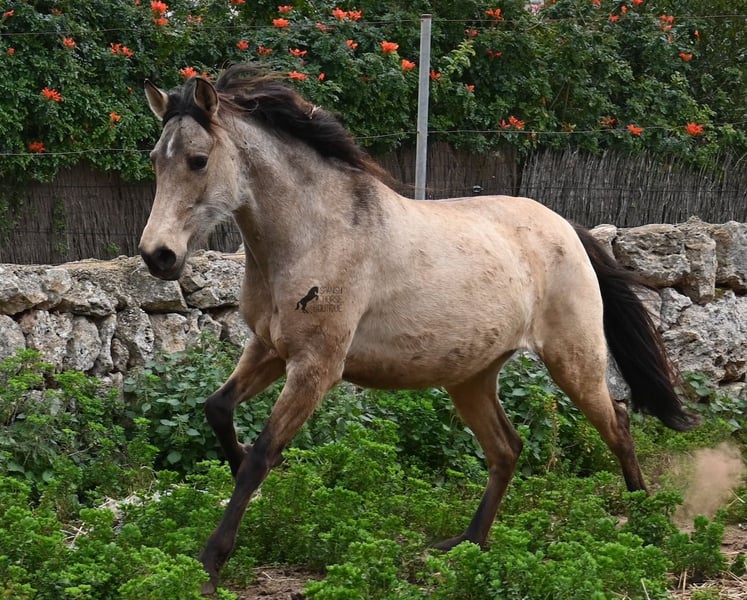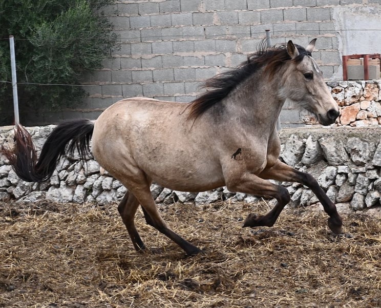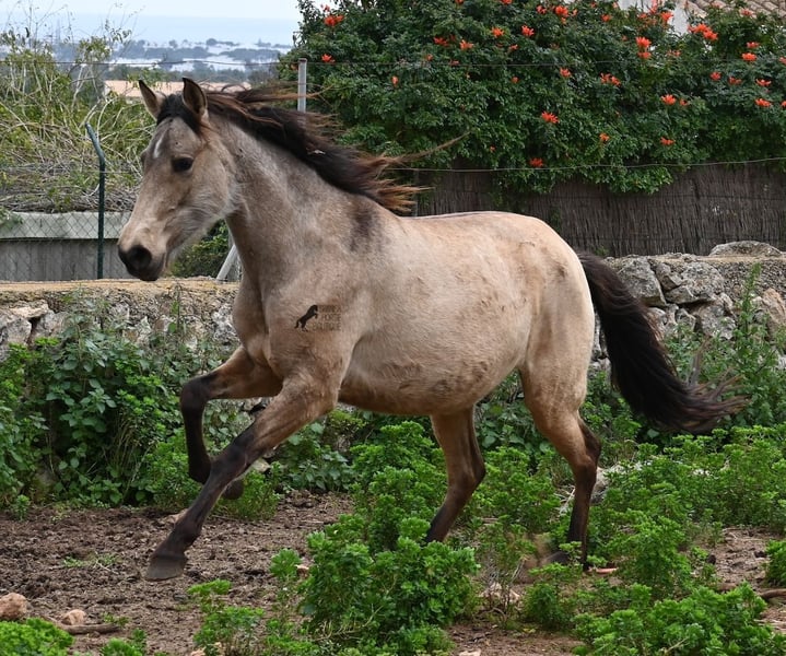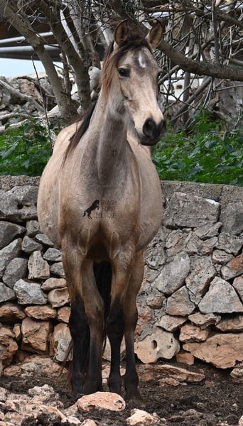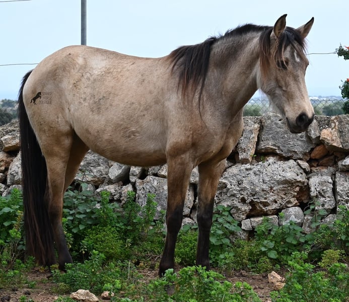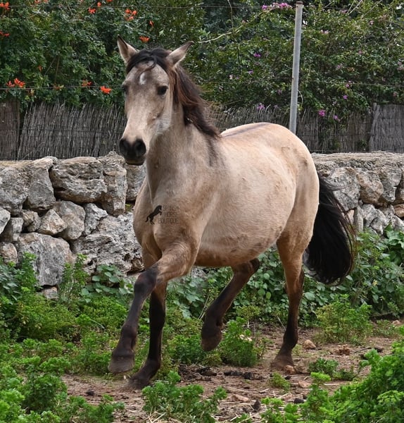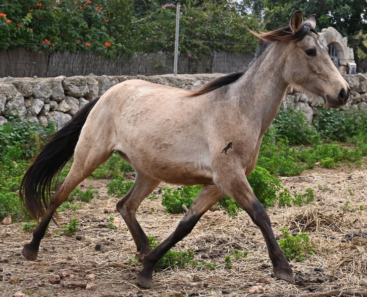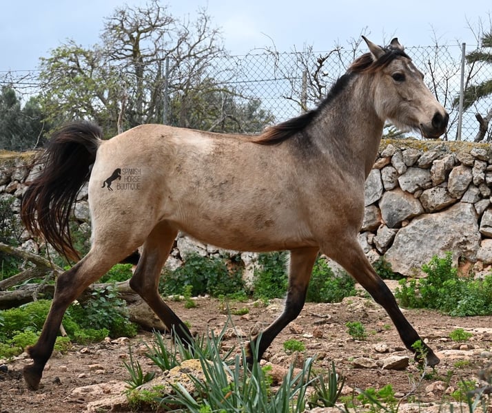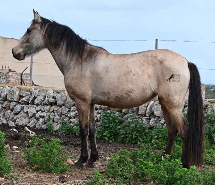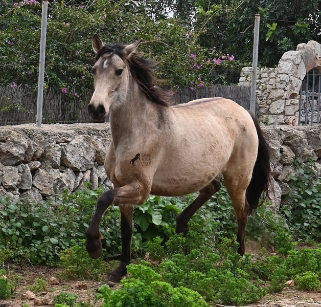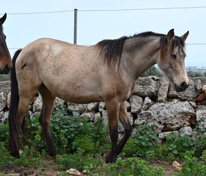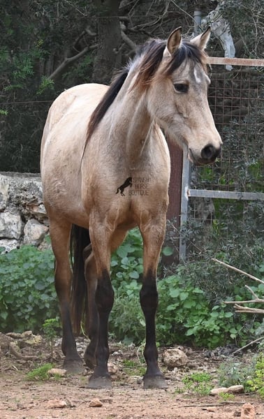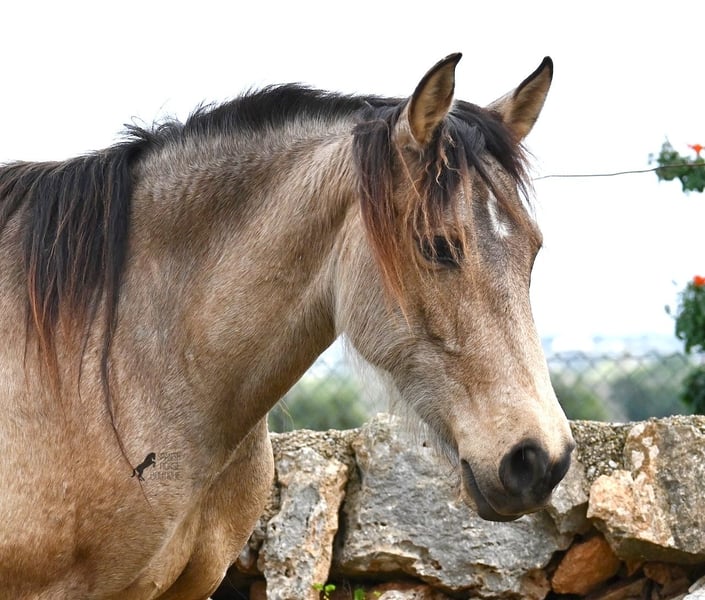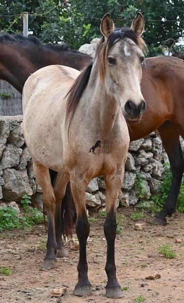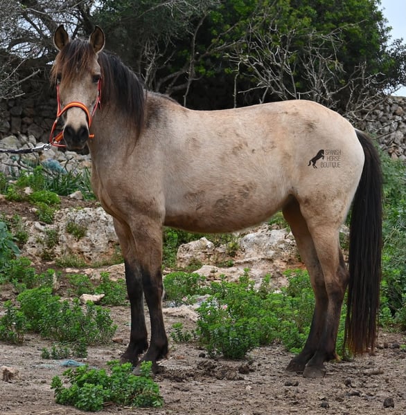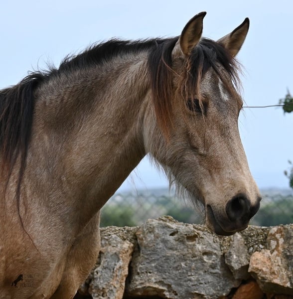 Born in 2019, this dun mare is a real raw jewel. Translated, the golden child's name means "chamomile" and she also has a very calming charisma. Although she is completely raw, she opens up within a few minutes and enjoys being cuddled and handled. She then follows you even when the herd moves in a different direction. With this people-friendly, open character, it will certainly be easy to break her in. Of course, there is also the option of organizing a ride on site. In the herd she is of medium to low rank and due to the 24h robustness, she is well socialized, resistant and well tied up, thanks to the stony ground. I estimate her final height to be 156cm, as it was not possible to measure her freely. She is currently in Mallorca! Videos and photos of the equine passport are available on request. I would be happy to organize an AKU, riding, transport or even your trip if you come to see her in person. Details can be found on my website or in conversation.
