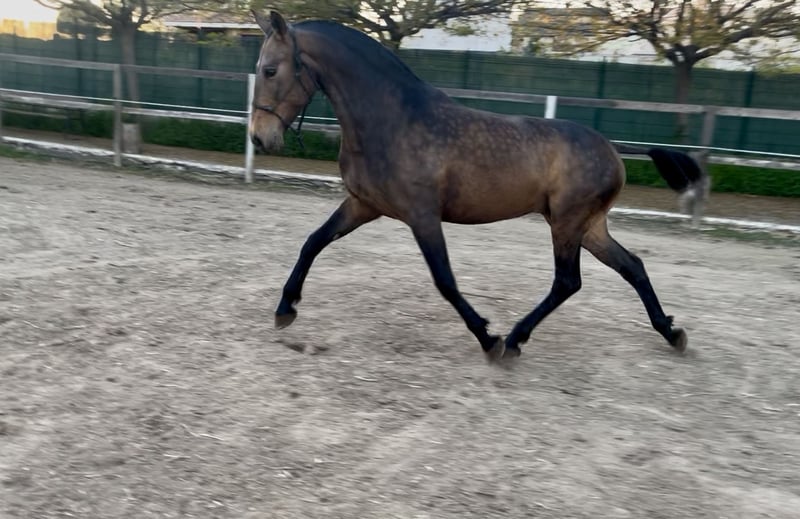 For sale: Purebred Spanish mare (PRE) with a bay coat carrying the cream gene. Approved as a broodmare and already producing excellent dilute foals. She is 8 years old, stands at 162 cm, and comes from the Divo PM bloodline of the prestigious Paco Martí stud. She is currently in foal to a beautiful 170 cm tall buckskin stallion. A great investment for breeding top-quality dilute foals. This is not a cheap mare, only serious enquiries by private message.