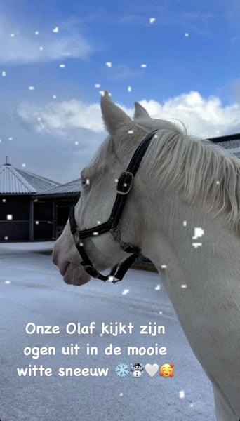 Blauwe ogen van stilte. Een 11-jarige Andalusië-ruin (1,54 m) in de zeldzame speciale kleur Cremello – met oceaanblauwe ogen, zo helder en kalm als de horizon boven de zee. Hij brengt een rust mee die niet te verklaren is. Je voelt het zodra je naast hem staat. Open van geest, verfijnd in uitdrukking.