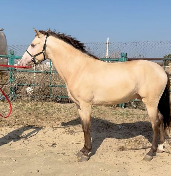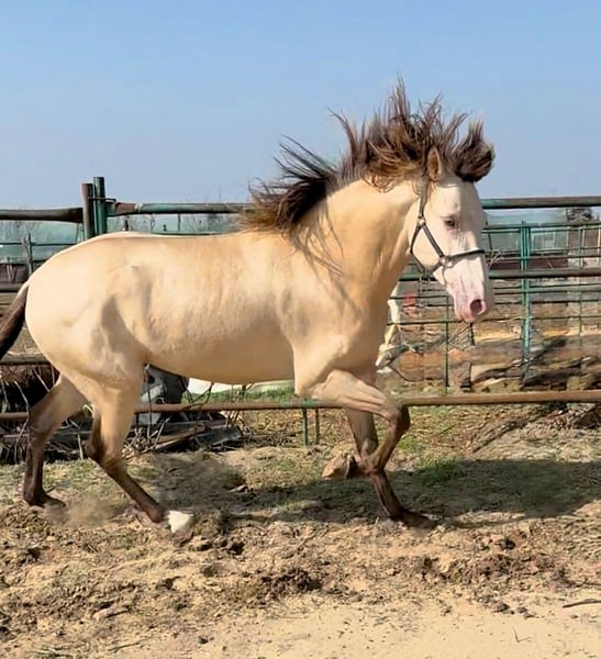 Temperament: Santero is one of the few champagne-colored Baroque stallions. He immediately captivates with his golden (amber) eyes, friendly personality, and zest for life. He is still fully growing, and his beautiful Baroque conformation is already evident. Santero has excellent radiographs, which we are happy to provide. This young stallion has a passport and lives in a loving environment with a well-known show rider. He has not yet been ridden. Upon request and at the buyer’s expense, the dream prince can be gently and carefully backed. For more information, please contact: WhatsApp 0175 861 45 35.