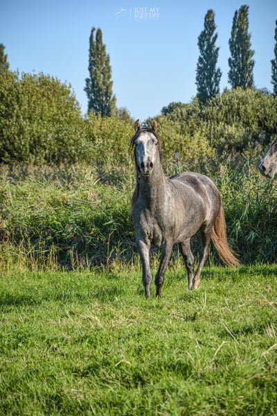 Mellizos is a super nice and sweet horse. He is 1.50 meters tall. For the past six months, he has been ridden under saddle. He is picking this up very well and really enjoys it. He has been on trail rides in the forest and also in the polder. He found tractors, buses, and other large traffic perfectly fine. Mellizos came to us as a foal and grew up among the other horses at our home. He loves attention and is social with other horses. He is not a complicated horse with any defects.
