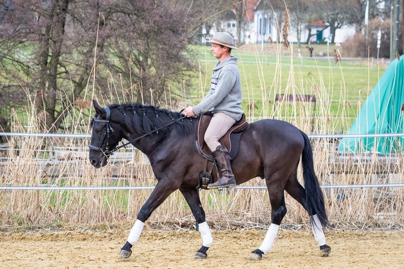 Zum Verkauf steht unser bildschöner 5-jähriger Andalusier Wallach mit toller Ausstrahlung und bestem Charakter. Er hat ein Stockmaß von ca. 155 cm und befindet sich aktuell in der Grundausbildung. Altersgerecht gearbeitet zeigt er sich unter dem Sattel stets motiviert, lernwillig und sehr brav. Im Gelände ist er unerschrocken und das Verladen sowie Fahren bereitet ihm keinerlei Probleme. Im täglichen Umgang präsentiert er sich ruhig, lieb und sehr menschenbezogen. Er kennt den Umgang mit Kindern und Hunden und bleibt auch in neuen Situationen gelassen und nervenstark. Durch seine tolle Einstellung eignet sich dieser Wallach sowohl als zuverlässiger Freizeitpartner als auch als Nachwuchspferd mit weiterem Entwicklungspotenzial. Videos sowie weitere Bilder sende ich bei ernsthaftem Interesse gerne zu. Bei Fragen oder Interesse freue ich mich über eine private Nachricht.