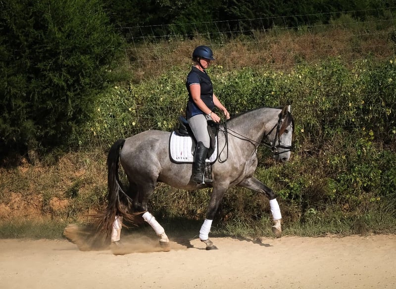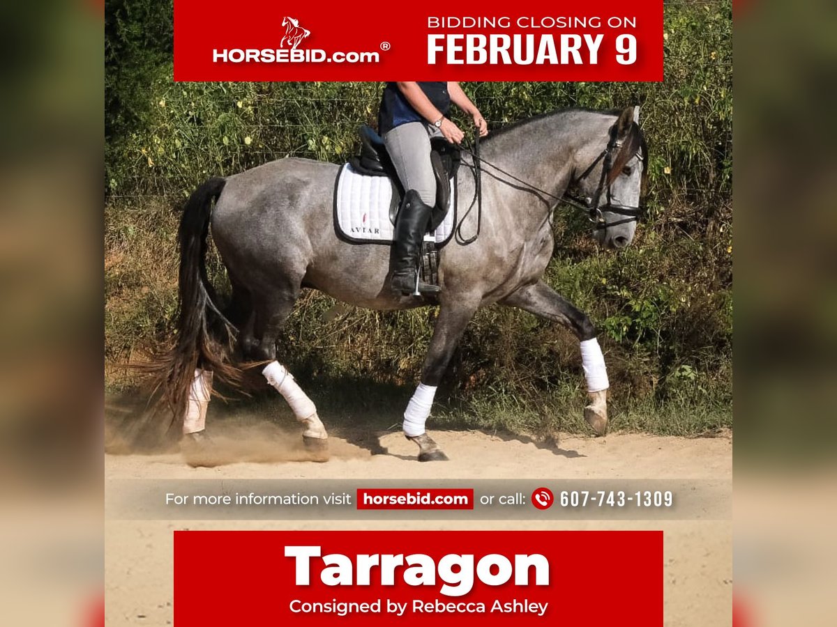 ❤️🔥𝑩𝒆 𝑴𝒊𝒏𝒆 𝐒𝐄𝐋𝐄𝐂𝐓❤️🔥 Happening now thru MONDAY | FEBRUARY 9th - Available EXCLUSIVELY on HorseBid's website! For more details and to register visit: www.Horsebid.com CONSIGNOR CONTACT: Rebecca Ashley 607-743-1309 LOCATION: Troutman, NC BREED: Andalusian REGISTERED: Yes REGISTERED NAME: RHF Tarragon COLOR: Grey HEIGHT: 16 AGE: 5 GENDER: Gelding Tarragon is a 5-year-old registered PRE Andalusian gelding with an exceptional brain and a very amateur-friendly temperament. He is soft, straightforward, and uncomplicated to ride, comfortably going on a loose rein or stepping into correct contact when asked. Although trained in dressage, Tarragon is versatile and could easily transition to western disciplines, including Ranch Horse classes, Horsemanship, and Western Dressage. He has an excellent foundation with lateral work and balanced transitions, including leg yield, shoulder-fore, shoulder-in, haunches-in, half pass, extension, and collection. Tarragon was competed at the 2025 IALHA Championships at WEC Ocala, placing 4th out of 13 horses in a large Dressage Suitability class. He is currently schooling Second Level dressage. He has a green flying change in one direction and confirmed simple changes. He is extremely comfortable to ride, with smooth gaits that feel slow and easy in the saddle even when moving forward. He has good brakes and a reliable stop, making him suitable for timid or amateur riders. If unsure, he will quietly stop and assess rather than react. Tarragon is excellent in show environments and enjoys going new places. He is easy to haul, stands tied at the trailer, and handles day parking and showgrounds without issue. He lives outside 24/7 but stalls easily at overnight shows. He is kind with kids and teen riders and remains rideable and forgiving, though like any young horse, he benefits from clear, consistent aids. He stands quietly at the mounting block for mounting and dismounting and is easy to handle on the ground, in cross-ties, and when leading. He can have time off and come back the same horse. He is food motivated, eager to learn, and consistently wins over amateur riders. His breeder is supportive of showing and may assist the new owner with stalls or entry fees once per year at IALHA-recognized shows. Virtual lessons and post-sale support are available to ensure a successful transition for Tarragon and his new rider.