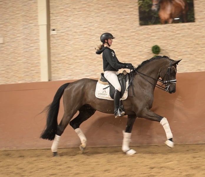 Liebe Interessenten, Für Terminvereinbarungen Probereiten senden Sie mir bitte eine WhatsApp. Für weitere Fragen bin ich tagsüber per WhatsApp erreichbar, telefonisch erreichen Sie mich am Besten zwischen 16 und 19 Uhr. Ich freue mich auf eine Kontaktaufnahme www.angelina-devittorio.de ⭐️Dracoon Hill⭐️ Alter: 7 Jahre (2029) Größe: ca 1,68 m Abstammung: Devonport x Astrix Ausbildungsstand: Dressurpferde M platziert AKU: Gute Röntgenbilder vorhanden. Da der Wallach gelegentlich koppt (Aufsetzkopper) wird er weit unter Wert verkauft. Keinerlei Probleme damit. Er befindet sich im oberen Bereich der Preisspanne Zum Verkauf steht ein wunderschöner, siebenjähriger Sohn des Devonport mit drei herausragenden Grundgangarten und erstklassiger Ausbildung. Dieser talentierte Wallach überzeugt nicht nur durch seine sehr gute Grundqualität, sondern auch durch zahlreiche Erfolge im Sport. Bereits in jungen Jahren konnte er viele Platzierungen und Siege in Jungpferdeprüfungen sammeln. Vierjährig wurde er Fünfter beim Landeschampionat, erzielte in Dressurpferdeprüfungen Einzelnoten bis 9,0 und war in der vergangenen Saison bis Dressurpferde-M hoch platziert. Sein Bewegungsablauf ist geprägt von einem elastischen, schwungvollen Trab, einer sehr guten, gesetzten praktischen Galoppade sowie einem überragenden, taktsicheren Schritt. Neben seiner sportlichen Qualität besticht er besonders durch seinen einmaligen Charakter:Kopfklar, absolut ehrlich und mit einem Herz aus Gold. Er ist sehr angenehm zu reiten, sitzt sich „wie ein Sofa“ und bereitet jeden Tag Freude. Ob Ausreiten, Baden gehen oder täglicher Umgang – er zeigt sich stets brav, unkompliziert und menschenbezogen. Durch seine Rittigkeit und sein ausgeglichenes Wesen eignet er sich ideal für Umsteiger, Junioren oder auch als hochwertiges Familienpferd mit sportlicher Perspektive. Ein Traumpferd in jeder Hinsicht. ⚜️ Tel: 0171-3438949 ⚜️ E-Mail: a.devittorio@web.de ⚜️ https://www.ehorses.de/angelinadevittorio ⚜️ Facebook und Instagram: Angelina De Vittorio