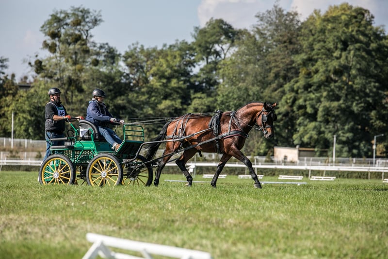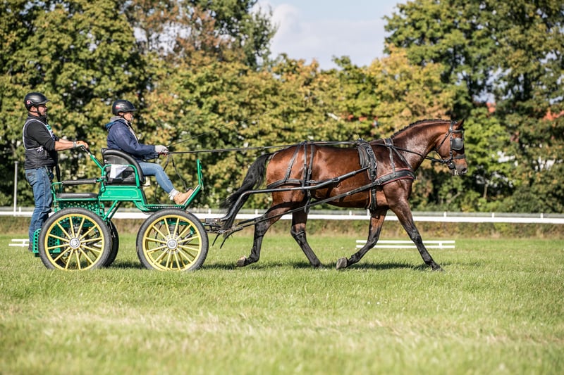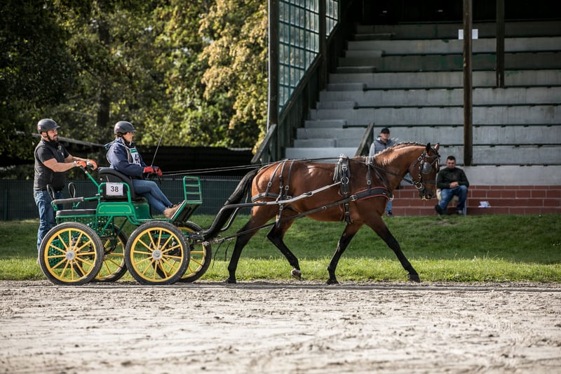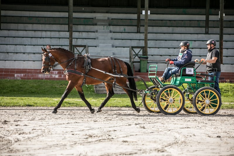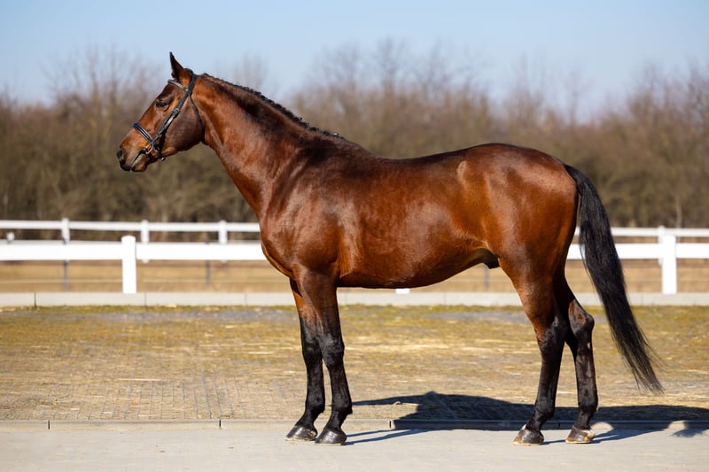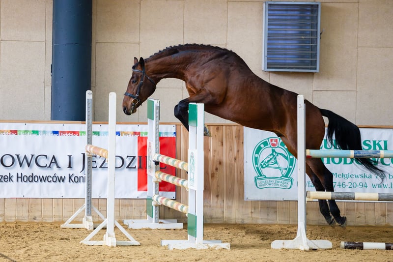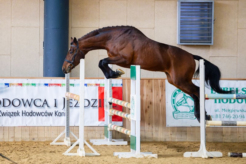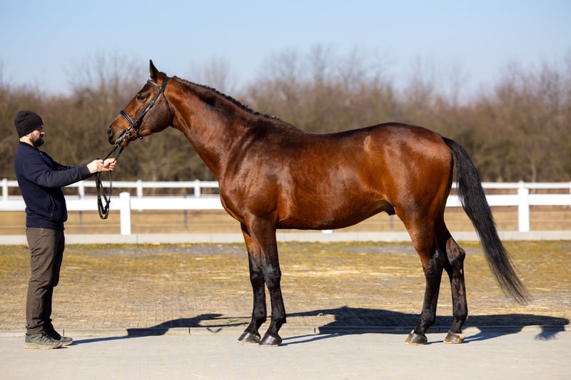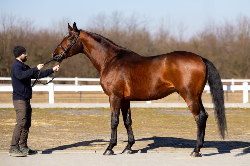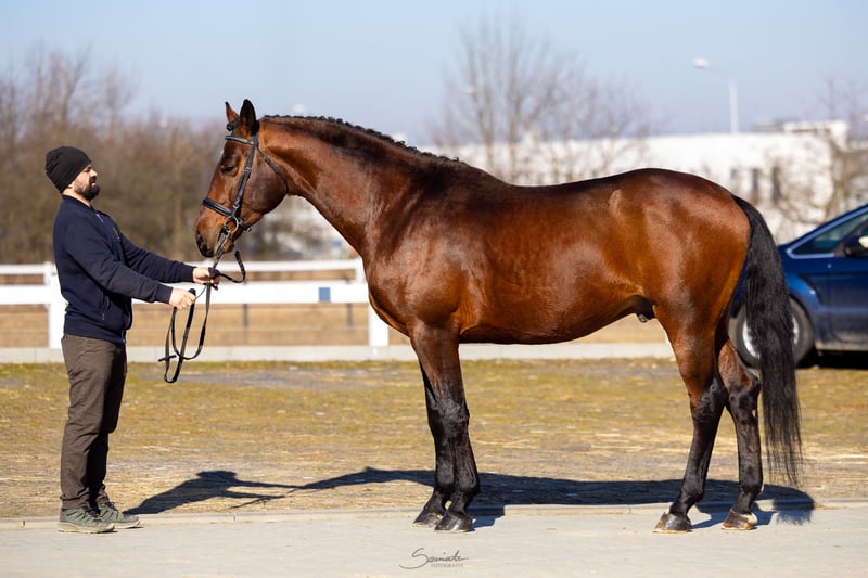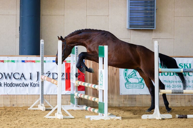 Junger Hengst Dan-Ber, sired by Brand Magic out of Draga by Hayati, of Małopolska breed, born on June 16, 2021, with a bay coat, measurements: 166-195-21 cm. Conformation score: 79 points. Dan-Ber is a young noble stallion with a good type (received 7.5 points for type and 7.5 for build in the linear assessment), exhibiting a well-structured and correct conformation (special attention should be paid to his large, correct hooves, for which he scored 8 points during the conformation evaluation). He is endowed with good, elastic movement in all three basic gaits and shows very good technique and strength in jumping, with consistent performance in the ring. Dan-Ber is a horse with 60% XX blood, possessing a very balanced and steady character. He is a strong horse with good movement, especially noted for his excellent walk and trot. In harness work, he is very rideable and responsive to aids. Dan-Ber is one of three licensed sons of Brand Magic (the others being Maximus AA and Elan AA, with temporary licenses), and he is the first with a lifetime license. His sire: Brand Magic is a tall (170-193-20.5 cm), very handsome modern sport-type stallion, with expressive, elastic movement in all three gaits, a very good character, and a strong willingness to cooperate with humans. He was sold to Germany, where he received a Westphalian license and is currently in dressage and eventing training. The sire of Brand Magic: Mighty Magic (Mythens xx – Heraldik xx) was Vice World Champion Young Event Horses (CIC**) at age 6 and World Champion at age 7, competing in international CIC** events. He was Vice-Champion of Germany for 5-year-old event horses and is the dam sire of Berra (by Divisor xx), a brave and outstanding racehorse, winner of the Oaks in 2006, with two racing seasons and an excellent career: 5 wins, 1 second, 3 thirds, and 3 fourths, competing in both flat and hurdle races. The dam of Dan-Ber: mare Draga by Hayati, out of Donna by Hebron, is the only mare by Hayati, who was sold to France and now participates in show jumping competitions. She also participated in the 2016 Livestock Exhibition in Sitno, placing 5th. Achievements of Stallion Dan-Ber: - 6th place at the Carriage Driving Noble Breed Stallions Field Test in Wrocław, October 2–4, 2025. Scores: External driver’s assessment – 7.20; quadruped test – 6.20; trot speed test – 10.00; endurance test – 10.00; walk speed test – 5.00; temperament and character – 7.50; suitability for harness work – 6.50. Final score: 7.30 and lifetime breeding license. - March 6, 2025: Lublin Preliminary Selection of Noble Breed Stallions before qualification at SK Racot at the Equestrian Arena in Lublin. Dan-Ber was positively evaluated in jumping and free movement by the LZHK committee and preliminarily qualified for the PPO at Racot. - 27th National Youth Małopolska Breed Horse Championship, Białka, June 15–16, 2024. Dan-Ber placed 4th in the three-year-old stallion class with an overall score of 77.74 points. Individual scores: type – 8.10; head, neck, shoulders – 8.16; legs and hooves – 7.76; free gallop – 7.63; free trot – 7.76; free jumping – 7.56; walk in hand – 7.56. - 26th National Youth Małopolska Breed Horse Championship, Białka, June 10–11, 2023. Dan-Ber placed 7th in the two-year-old stallion class with an overall score of 74.27 points. Scores: type – 8.16; head, neck, shoulders – 7.70; legs and hooves – 7.06; free gallop – 7.60; free trot – 7.36; free jumping – 7.20; walk in hand – 6.67. - 25th National Youth Małopolska Breed Horse Championship, Białka, June 11–12, 2022. Dan-Ber placed 10th out of 20 in the yearling stallion class with an overall score of 77.84 points. Individual scores: type – 8.50; head, neck, shoulders – 7.83; legs and hooves – 8.17; free gallop – 7.50; free trot – 7.75; walk in hand – 7.00.