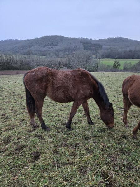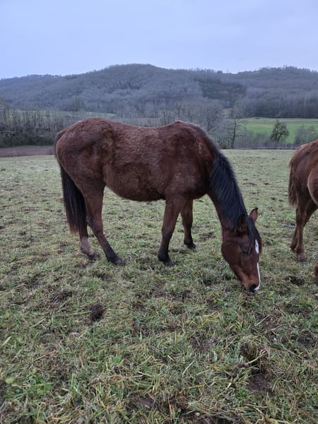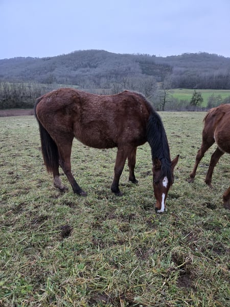 Jument anglo arabe née en avril 2024 prendra 2 ans cette année. Très grande pouliche très bien faite typée sport et bien éduquée (tiens a l'attache, transport, pansage, douche etc) Elle est très gentille très câlins. Elle fera le bonheur de sa future famille. Toise estimée à 165cm minimum. Maréchal à jour. Vermifuges. Elle vie en troupeau avec des copains de son âge pour un parfait équilibre. Super papier : Côté mère Enka d’ai : - No comment chayottes ISO 126 - Gral des vernieres ISO 138 - Dum’pom ISO 132 - Korrigan du Gevaudan ISO 154 - Belo des vernieres ISO 137 Et côté père Elfe de pompadour ISO 116: - Upsilon ICC 165 - Fusain ISO 162 - Véloce de favi ISO 156 - Encore une médaille ICC 147 Et j'en passe ... ! Superbe jument d'avenir dans le concours ou même l'élevage au vue de son pedigree. Pouliche calme et attachante très grande et bien faite beaucoup de chic et se déplace bien ! Elle est a venir rencontrer aux écuries de Léon. Transport possible dans toute la France.