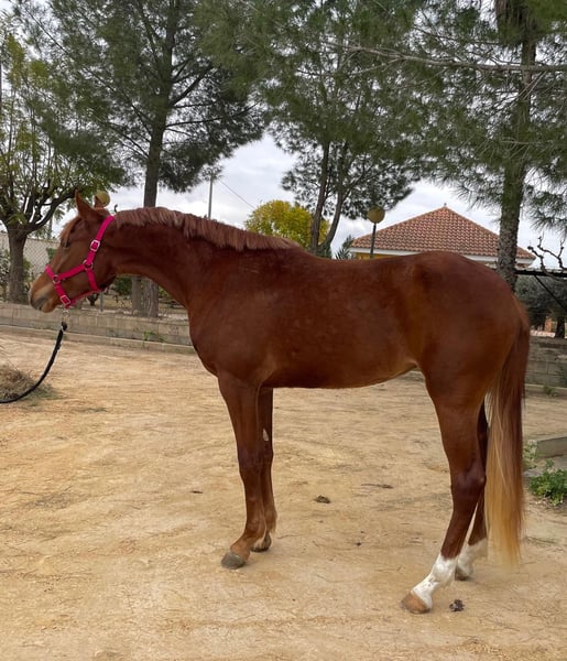 Potra alazana con muy buena proyección y futuro, 2 años y medio . Linea deportiva , buena morfología y funcionalidad , con tres aires muy buenos , cuesta arriba con mucha amplitud, funcional para doma , salto o raid o el deporte en general , noble y con buena cabeza.